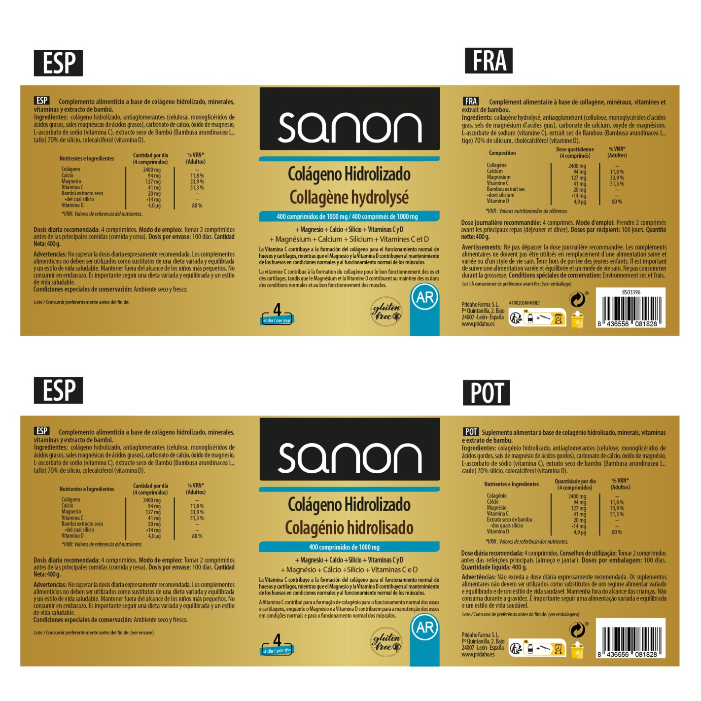 Colágeno hidrolizado, antiaglomerantes (celulosa, monoglicéridos de ácidos grasos, sales magnésicas de ácidos grasos), carbonato de calcio, óxido de magnesio, L-ascorbato de sodio (Vitamina C), extracto seco de Bambú (Bambusa arundinacea L., tallo) 70% de silicio, colecalciferol (Vitamina D).
