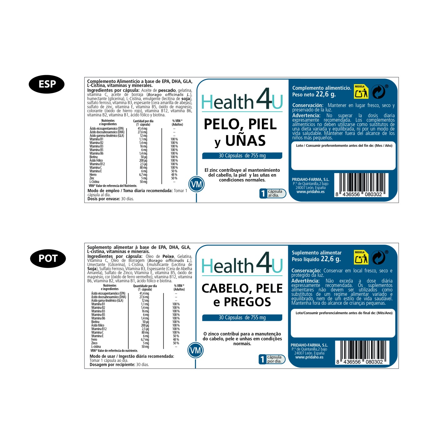aceite de pescado, gelatina, vitamina C, Aceite de borraja (borago officinalis L.), humectante (glicerina), L-Cistina, emulgente (Lecitina de soja), sulfato ferroso, vitamina B3, espesante (cera amarilla de abejas), sulfato de zinc, vitamina E, vitamina B5, óxido de magnesio, colorante (óxido de hierro rojo), vitamina B12, vitamina B6, vitamina B2, vitamina B1, ácido fólico y biotina.