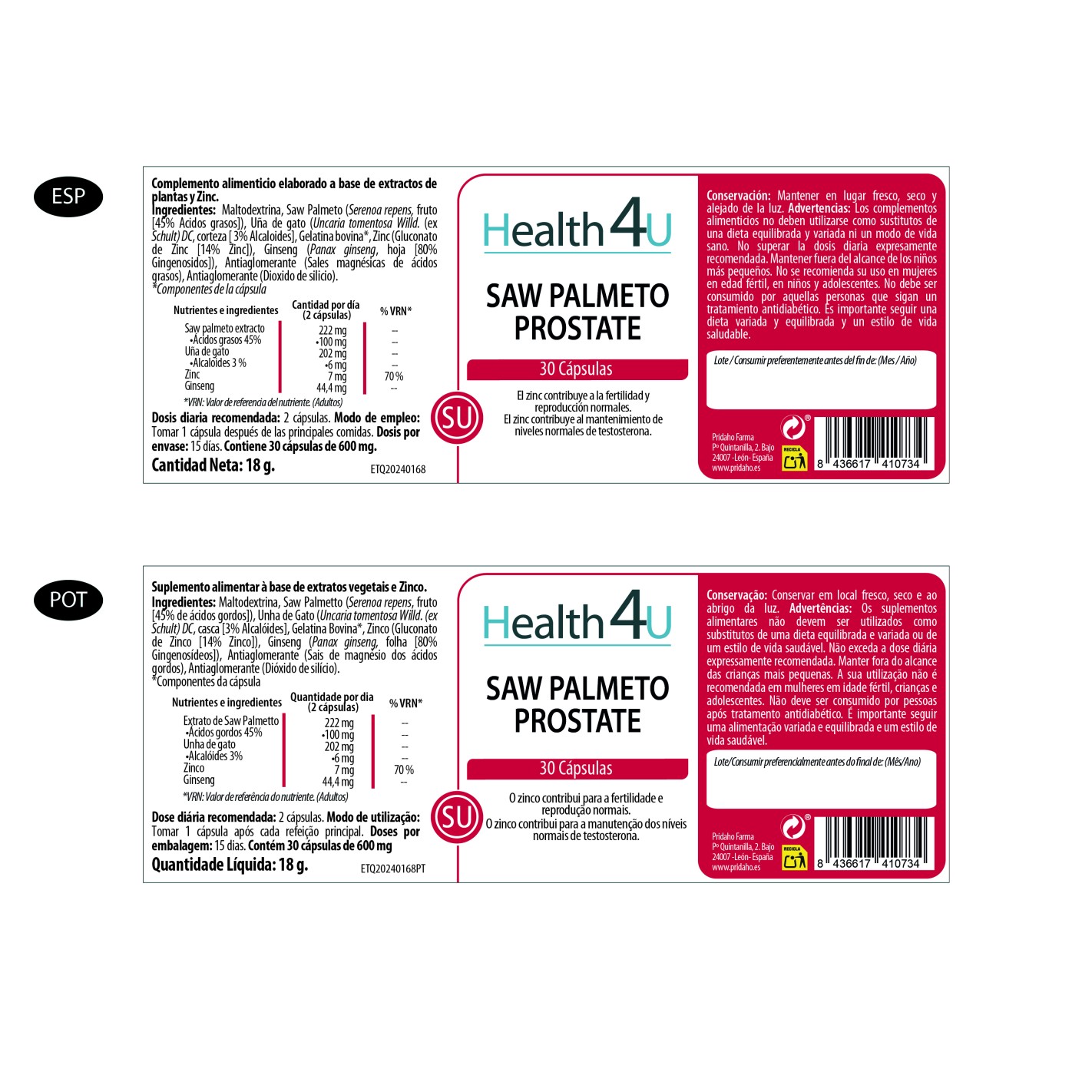 Maltodextrina, Saw Palmeto, (Serenoa repens, fruto [45% Acidos grasos]), Uña de gato (Uncaria tomentosa Wild. (ex Schult) DC, corteza [3% Alcaloides], Gelatina bovina*, Zinc (Gluconato de Zinc [14% Zinc], Ginseng (Panax Ginseng, hoja [80% Gingenosidos]), Antiaglomerante (Sales magnésicas de ácidos grasos), Antiaglomerante (Dióxido de Silicio).