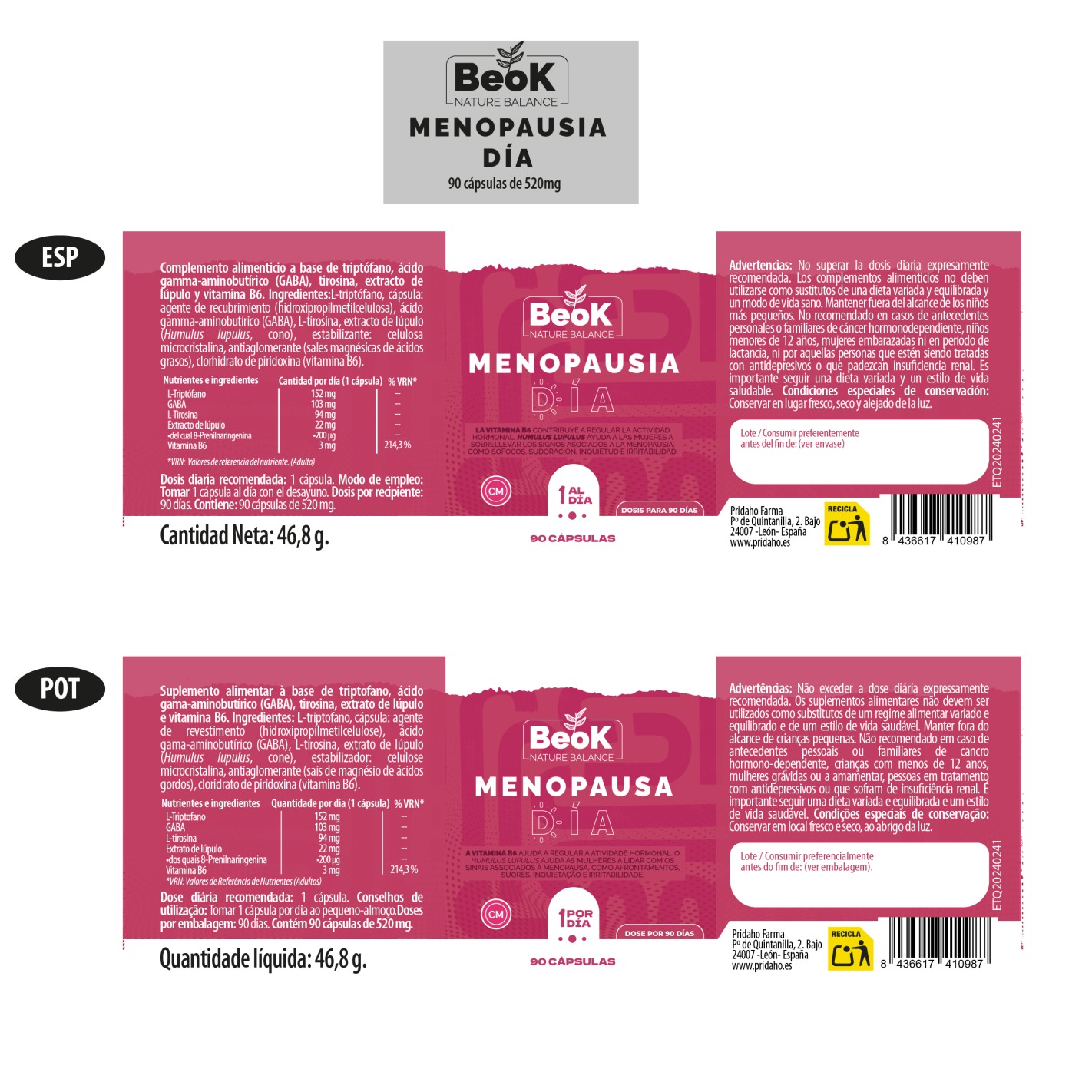 deben utilizarse como sustitutos de una dieta variada y equilibrada y un modo de vida sano. Mantener fuera del alcance de los niños mas pequeños. No debe ser consumido por personas que estén siendo tratadas con antidepresivos o que padezcan insuficiencia renal. No recomendado en caso de antecedentes personales o familiares de cáncer hormonodependiente. No recomendado para mujeres embarazadas y lactantes, niños y adolescentes, personas con inflamación, autoinmunes, epilepsia, asma, estado de ánimo, trastornos del comportamiento o de la personalidad, así como personas sometidas a tratamiento medicinal. El consumo tampoco esta recomendado para las personas que necesiten una vigilancia o seguridad sostenidas en las que la somnolencia puede plantear un problema de seguridad. Es importante seguir una dieta variada y equilibrada y un estilo de vida saludable. Condiciones especiales de conservación: Mantener en lugar fresco, seco y alejado de la luz.