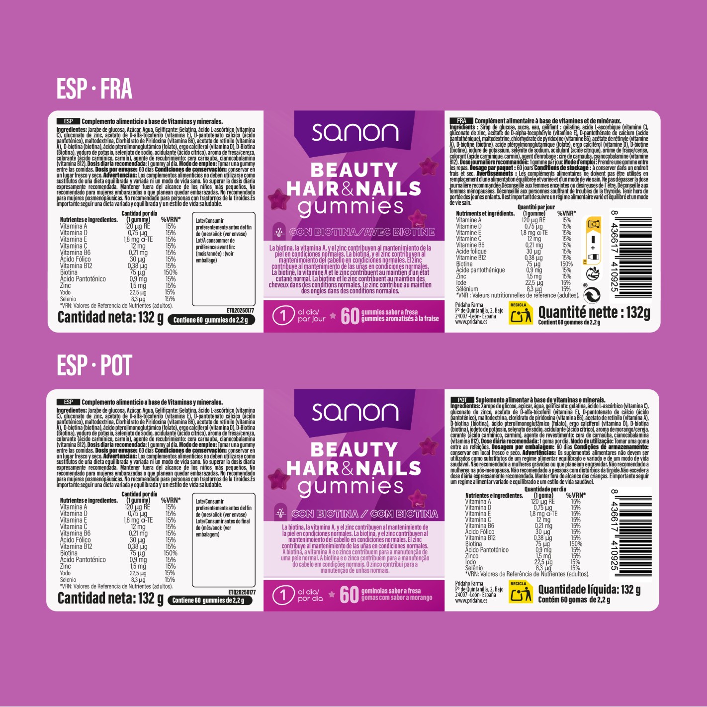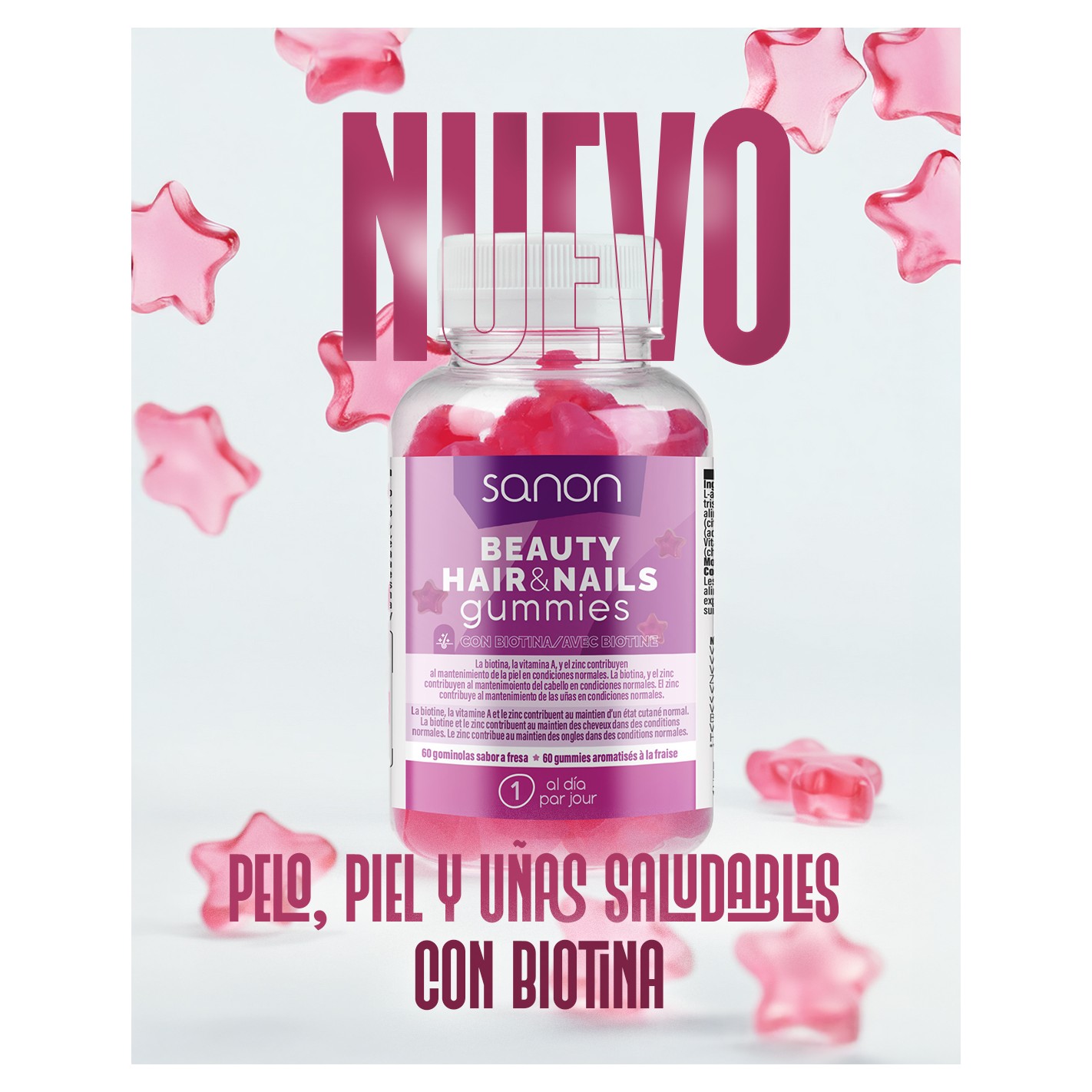 Jarabe de glucosa, Azúcar, Agua, Gelificante: Gelatina, ácido L-ascórbico (vitamina C), gluconato de zinc, acetato de D-alfa-tocoferilo (Vitamina E), D-pantotenato cálcico (ácido pantoténico), maltodextrina, Clorhidrato de piridoxina (Vitamina B6), acetato de retinilo (vitamina A), D-Biotina (biotina), ácido pteroilmonoglutámico (folato), ergo calciferol (Vitamina D), D-Biotina (Biotina), yoduro de potasio, seleniato de sodio, acidulante (ácido cítrico), aroma de fresa, colorante (ácido carmínico, carmín), agente de recubrimiento: cera carnauba, cianocobalamina (vitamina B12).