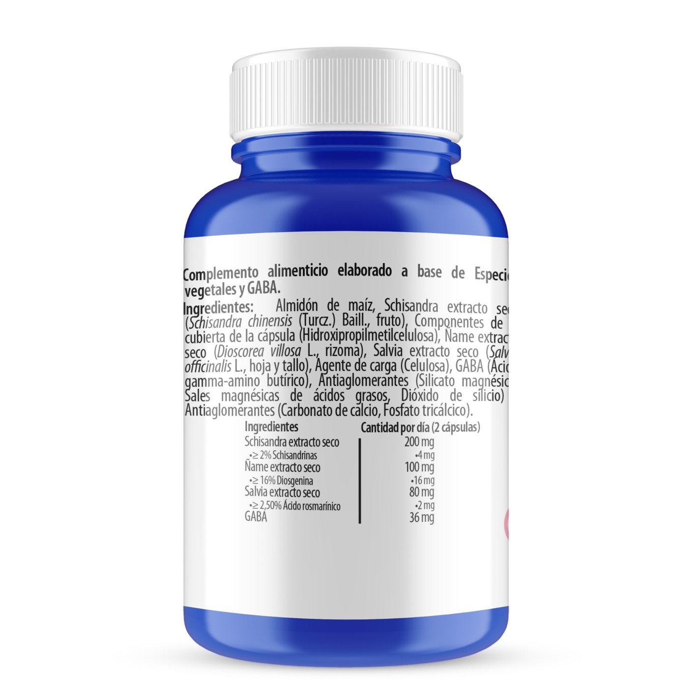 Almidón de maíz, Schisandra extracto seco (Schisandra chinensis (Turcz.) Baill., fruto), Componentes de la cubierta de la cápsula (Hidroxipropilmetilcelulosa), Ñame extracto seco (Dioscorea villosa L., rizoma), Salvia extracto seco (Salvia officinalis L., hoja y tallo), Agente de carga (Celulosa); GABA (Ácido gamma-amino butírico), Antiaglomerantes (Silicato magnésico, Sales magnésicas de ácidos grasos, Dioxido de silicio). Antiaglomerantes (Carbonato de calcio, Fosfato tricálcico).