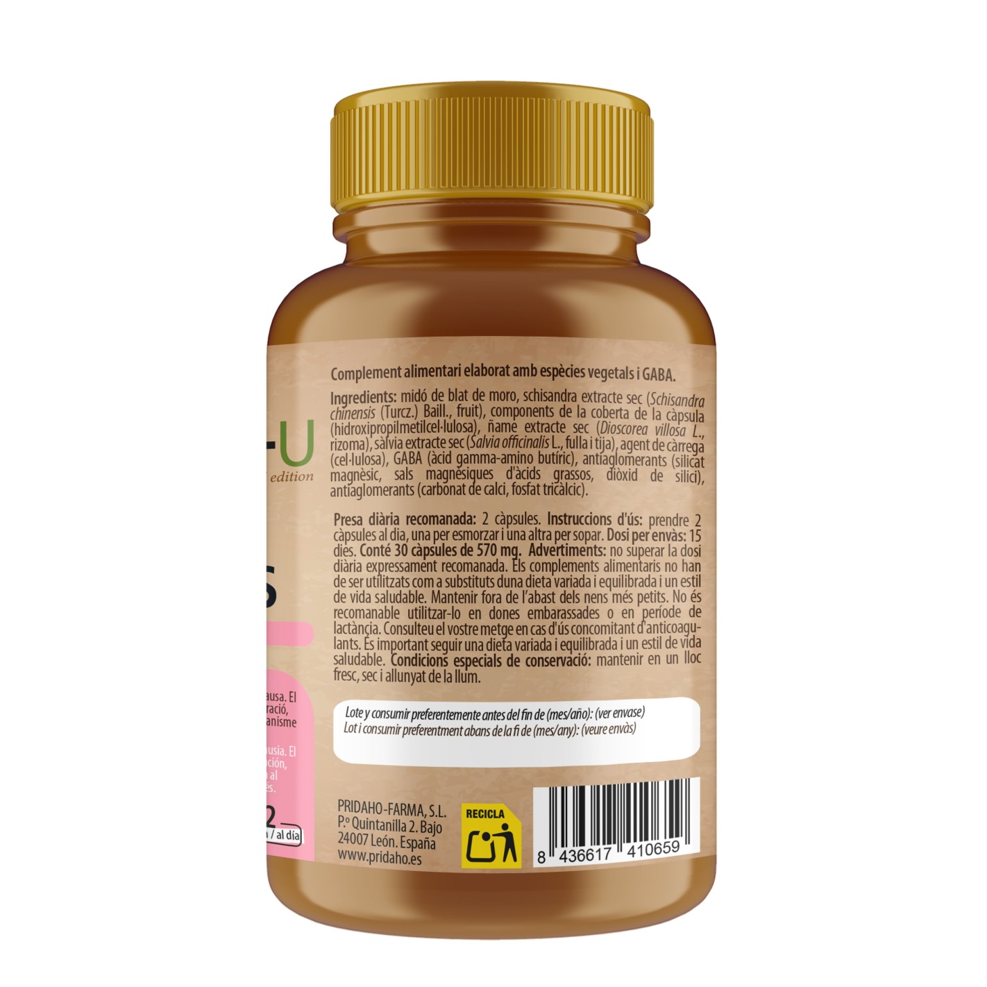 Almidón de maíz, Schisandra extracto seco (Schisandra chinensis (Turcz.) Baill., fruto), Componentes de la cubierta de la cápsula (Hidroxipropilmetilcelulosa), Ñame extracto seco (Dioscorea villosa L., rizoma), Salvia extracto seco (Salvia officinalis L., hoja y tallo), Agente de carga (Celulosa); GABA (Ácido gamma-amino butírico), Antiaglomerantes (Silicato magnésico, Sales magnésicas de ácidos grasos, Dióxido de silicio). Antiaglomerantes (Carbonato de calcio, Fosfato tricálcico).