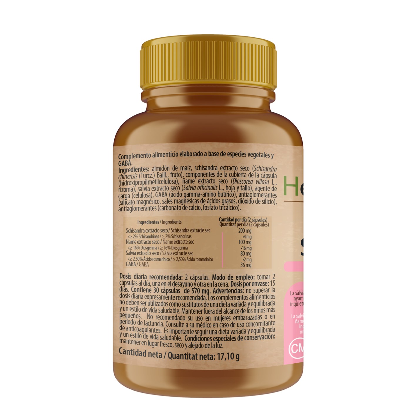 La salvia contribuye al confort durante la menopausia. El ñame ayuda a sobrellevar los sofocos, la sudoración, inquietud e irritabilidad. La Schisandra ayuda al organismo a adaptarse a situaciones de estrés.