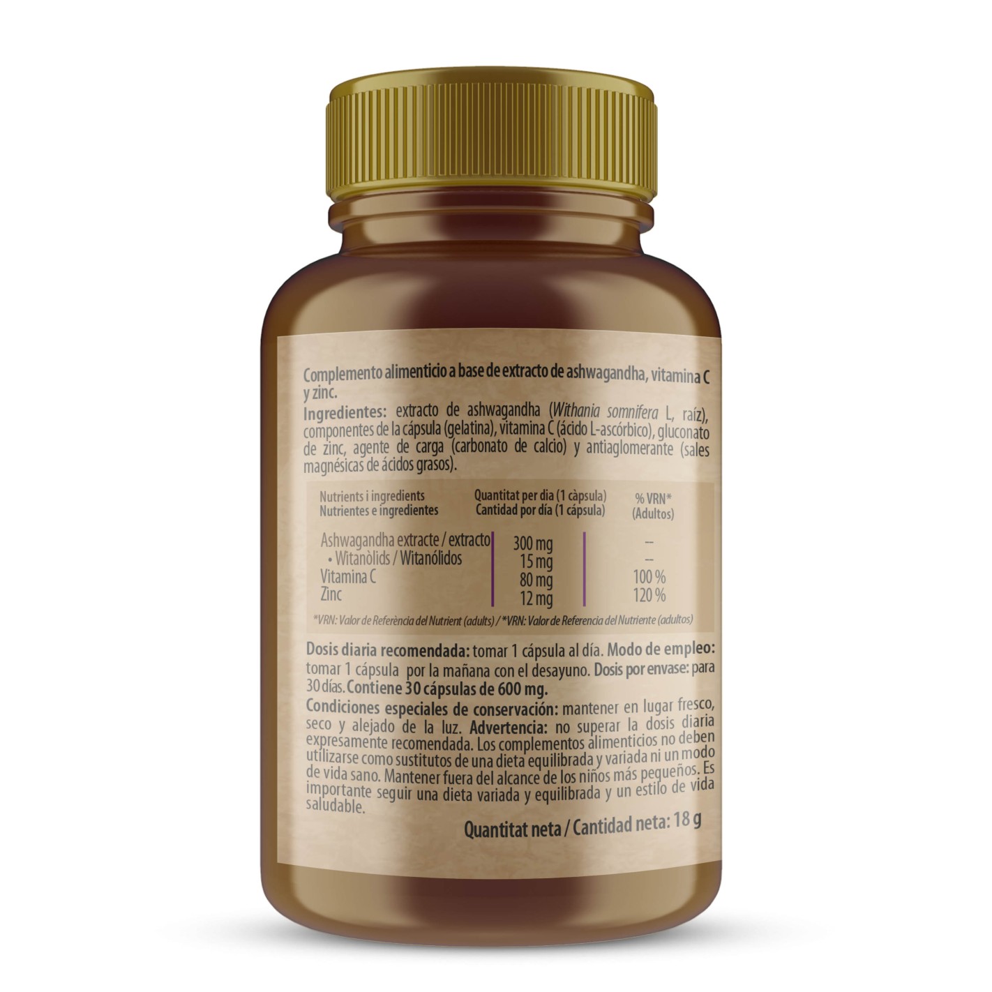 Ingredientes por cápsula: Extracto de ashvagandha (Withania somnifera L, raíz), Componentes de la cápsula (gelatina), Vitamina C (Ácido L-ascórbico), Gluconato de Zinc, Agente de carga (carbonato de calcio), Antiaglomerantes (sales magnésicas de ácidos grasos).