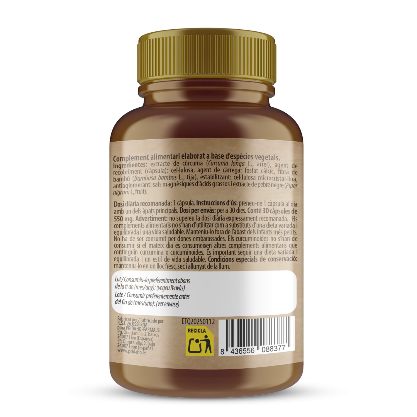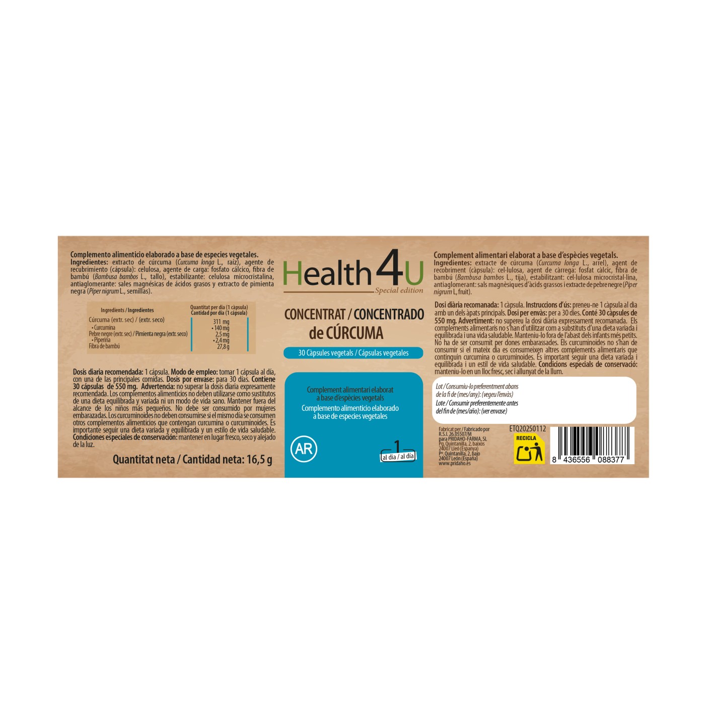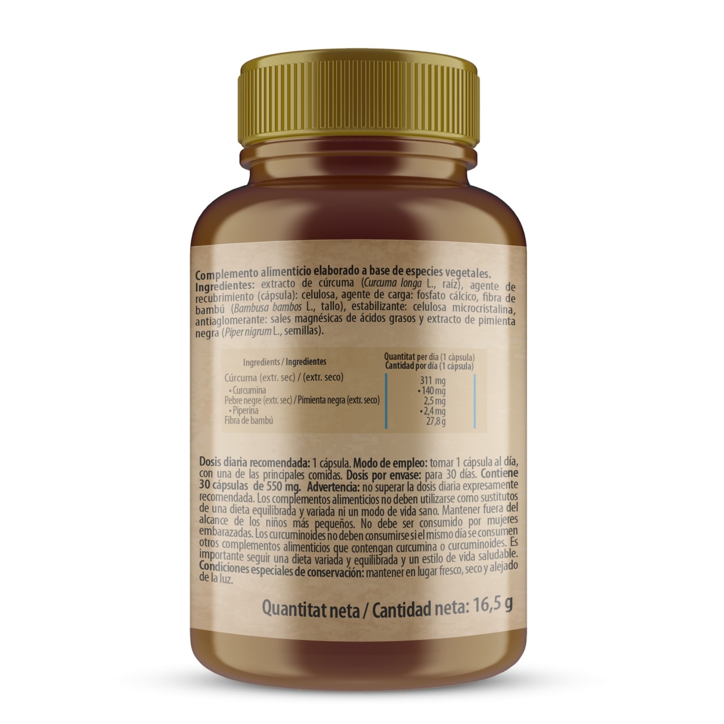 Ingredientes por cápsula: extracto de cúrcuma (cúrcuma longa L., raíz) Agente de recubrimiento (cápsula): celulosa, agente de carga: fosfato cálcico (E 341), Fibra de bambú (bambusa bambos L, tallo) Estabilizante: celulosa microcristalina (E 460) Anti aglomerante: estearato de magnesio (E 470b), Extracto de pimienta negra (piper nigrum L., semillas).