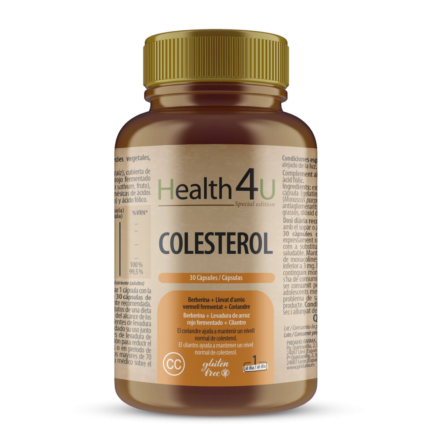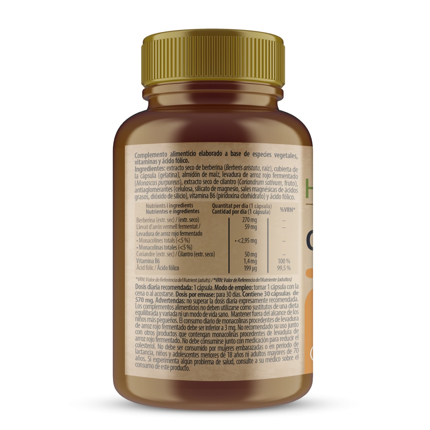 Berberina + Levadura de arroz rojo fermentado + cilantro. El cilantro ayuda a mantener un nivel normal de colesterol.