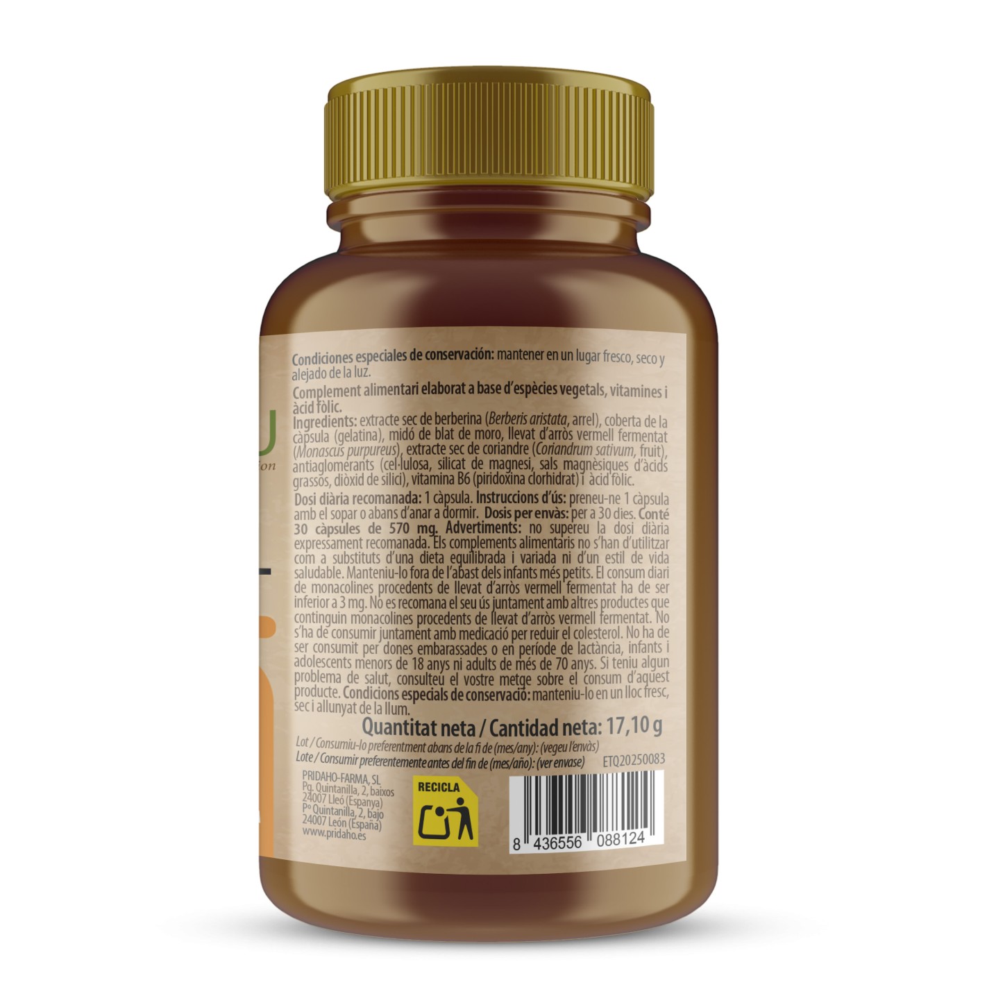 Berberina extracto seco (Berberis aristata, raíz), Cubierta de la cápsula (Gelatina); Almidón de Maíz; Levadura de arroz rojo fermentado (Monascus purpureus), Cilantro extracto seco (Coriandrum sativum, fruto), Antiaglomerantes (Celulosa, Silicato de magnesio, Sales magnésicas de ácidos grasos, Dióxido de silicio), Vitamina B6 (Piridoxina clorhidrato), Ácido fólico.