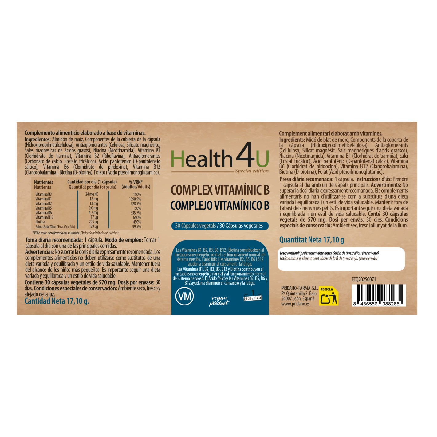 Las Vitaminas B1, B2, B3, B6, B12 y biotina contribuyen al metabolismo energético normal y al funcionamiento normal del sistema nervioso. El ácido fólico y las vitaminas B2, B5, B6 y B12 ayudan a disminuir el cansancio y la fatiga.