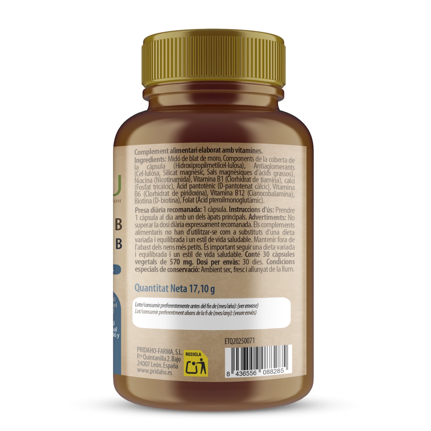 Ingredientes por cápsula: Fibra de bambú (Bambusa bambos (L), tallo), agente de recubrimiento (cápsula): celulosa y óxido de zinc, nicotinamida (Vitamina B3), riboflavina (vitamina B2), clorhidrato de tiamina (vitamina B1), D-Pantotenato cálcico (vitamina B5), clorhidrato de piridoxina (vitamina B6), antiaglomerantes: sílice (E551) y estearato de magnesio (E-470b), cianocobalamina (vitamina B12); Maltodextrina, D-biotina, ácido pteroilmonoglutámico (ácido fólico).