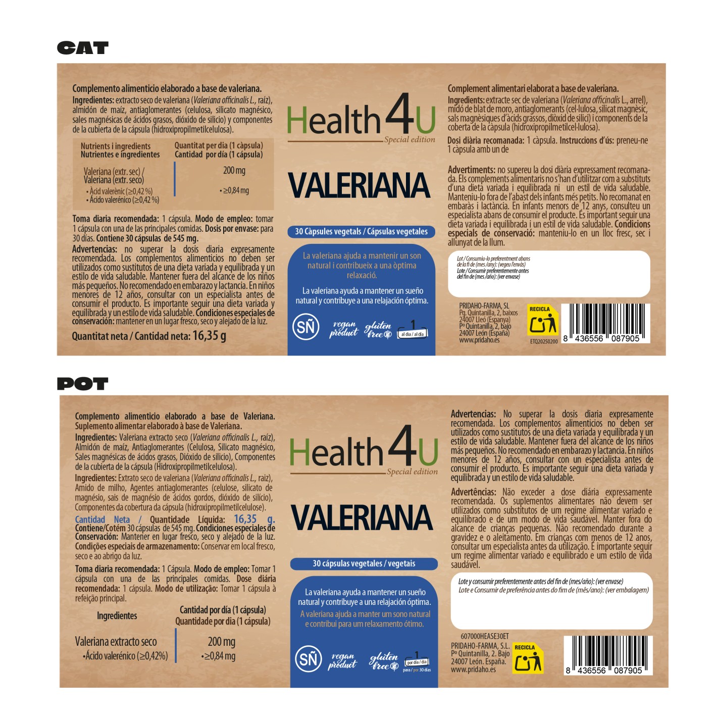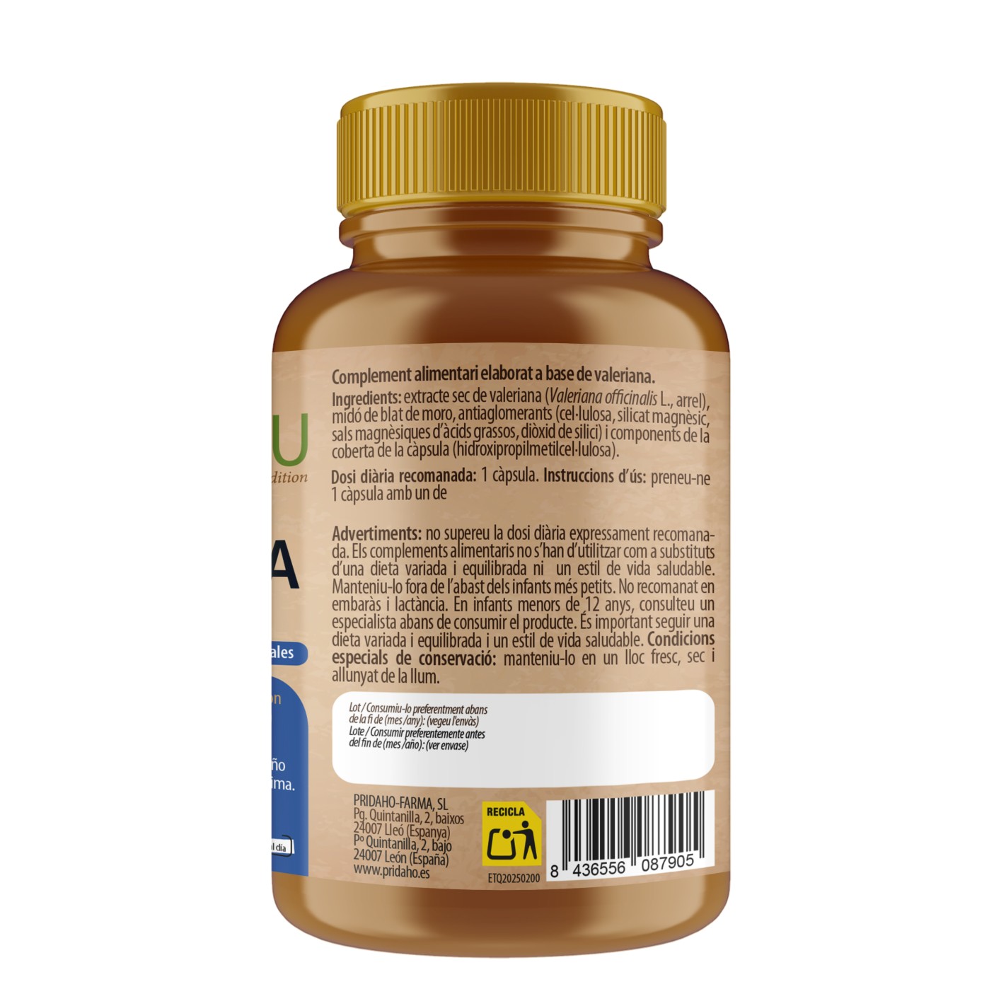 Ingredientes: Valeriana Extracto seco (Valeriana officinalis L. raíz), Almidón de maíz, Antiaglomerantes (Celulosa, Silicato magnésico, Sales magnésicas de ácidos grasos, Dióxido de silicio), Componentes de la cubierta de la cápsula (Hidroxipropilmetilcelulosa).