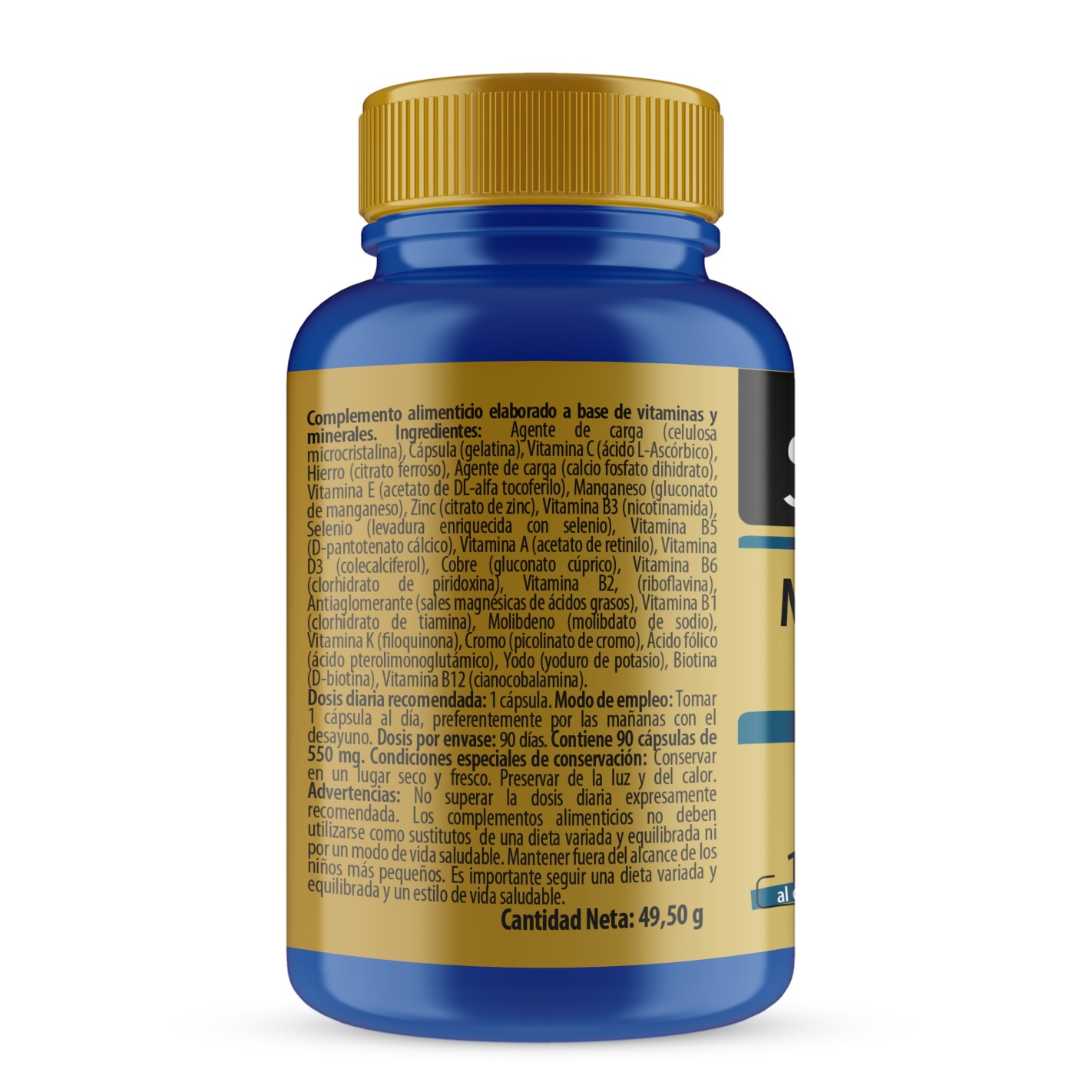 Ingredientes por cápsula: Agentes de carga (celulosa microcristalina y fosfatos de calcio), Cápsula(gelatina), Vitamina C (ácido L-Ascórbico), Hierro (citrato ferroso), Vitamina E (Acetato D-Alfa tocoferol), Manganeso (gluconato de manganeso), Zinc (citrato de zinc), Niacina (nicotinamida), Selenio (levadura enriquecida con selenio), Vitamina B5 ó Ácido pantoténico (D-Pantotenato cálcico), Vitamina A (acetato de retinilo), Vitamina D3 (Colecalciferol), Cobre (gluconato cúprico), Antiaglomerante (sales magnésicas de ácidos grasos), Vitamina B6 (clorhidrato de piridoxina), Vitamina B2 (rivoflavina), Vitamina B1 (clorhidrato de tiamina), Molibdeno (molibdato de sodio),Vitamina K (filoquinona), Cromo (picolinato de cromo), Folato o ácido fólico (ácido pteroilmonoglutámico), Iodo (yoduro de potasio), Biotina (D-Biotina), Vitamina B12 (cianocobalamina).