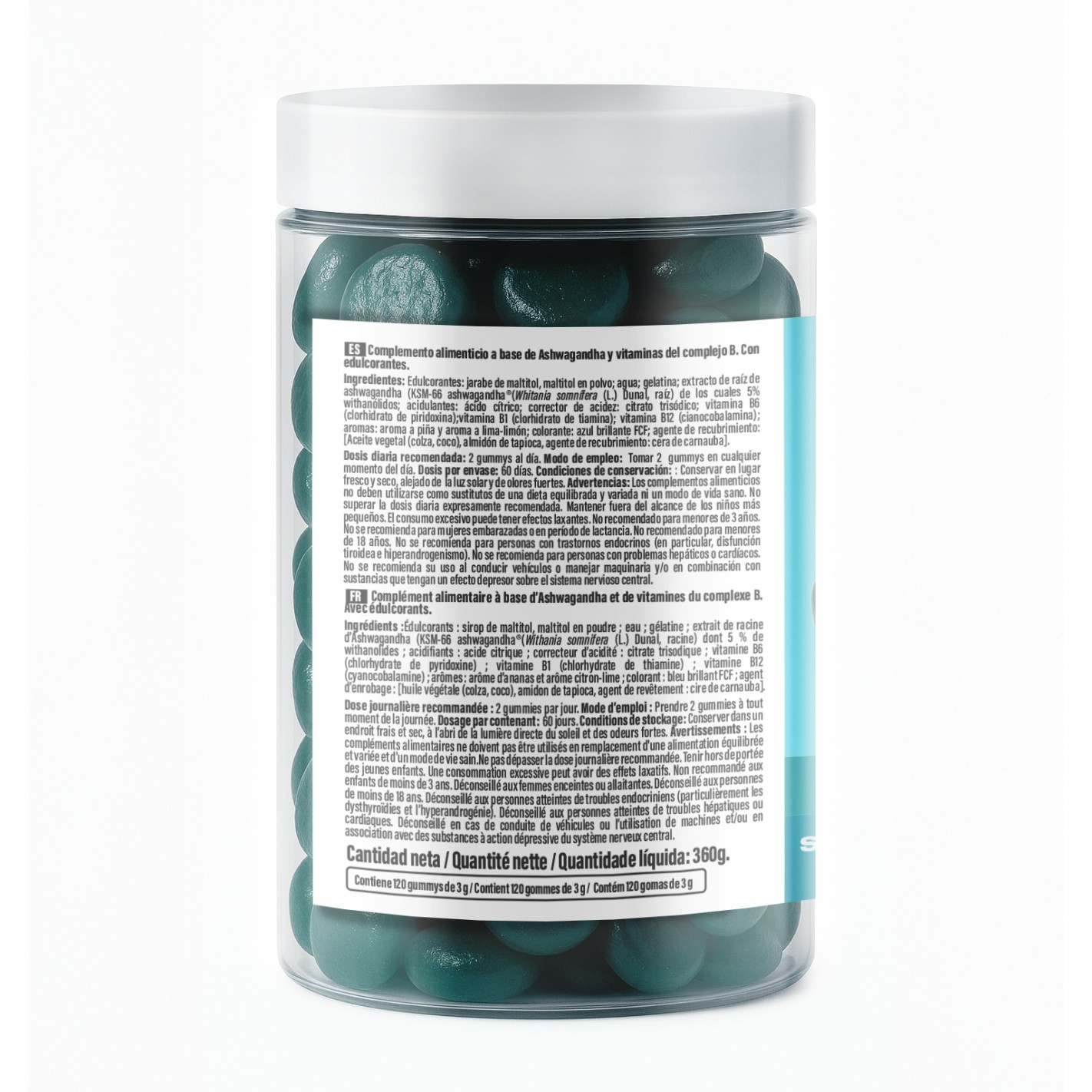 Complemento alimenticio a base de Ashwagandha y vitaminas del complejo B. Con edulcorantes.