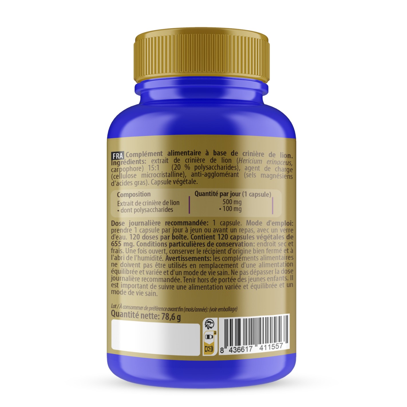 agua. 120 dosis por envase. Contiene 120 cápsulas vegetales de 655 mg.