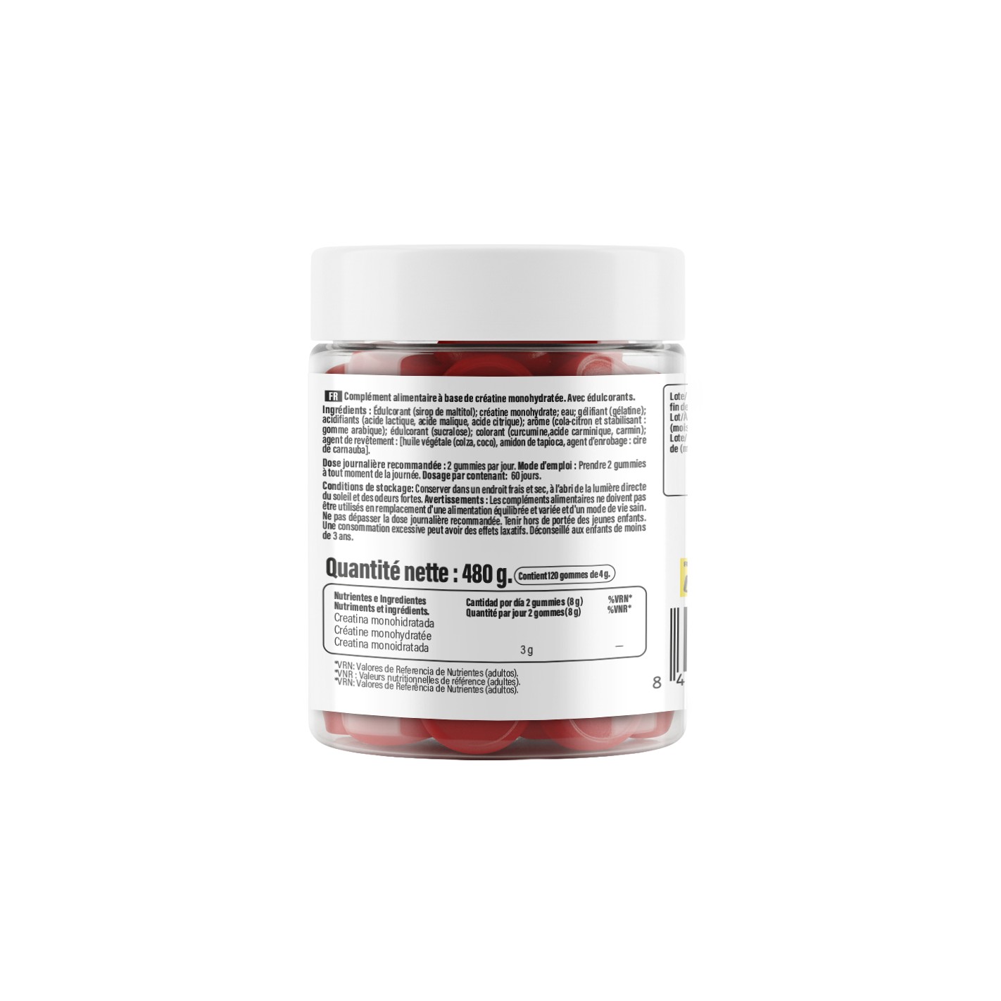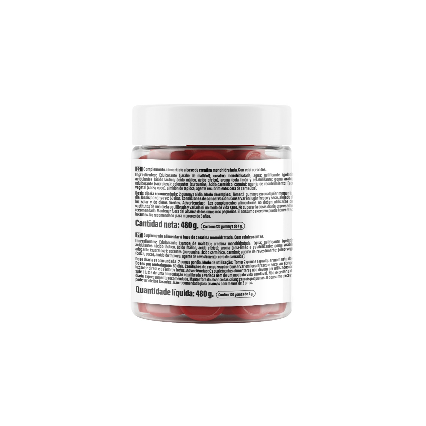 Edulcorante (jarabe de maltitol); creatina monohidratada; agua; gelificante (gelatina); acidulantes (ácido láctico, ácido málico, ácido cítrico), aroma (cola-limón y estabilizante, goma arábiga); edulcorante (sucralosa);