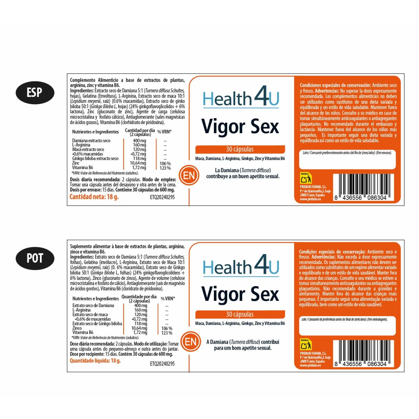Extracto seco de Damiana 5:1 (Turnera diffusa Wild, hoja), componente de la cápsula (gelatina), L-arginina, extracto seco de maca 10:1 (Lepidium meyenii Walp, raíz [0,6% macamidas]), extracto seco ginkgo biloba 50:1 (Ginkgo Biloba L, hoja) (24% Flavona glicósidos, 6% lactonas terpenicas]), zinc