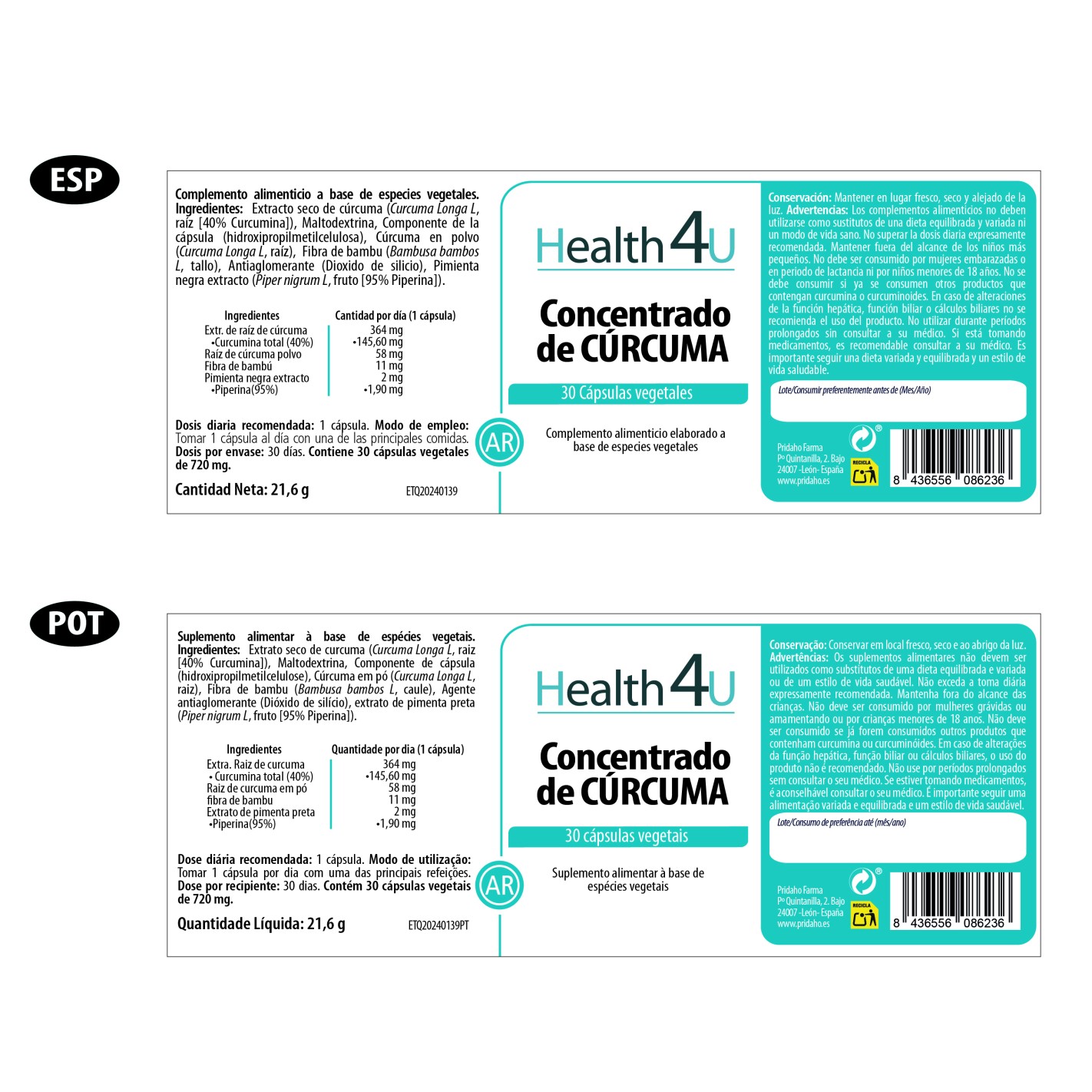 Los complementos alimenticios no deben utilizarse como sustitutos de una dieta equilibrada y variada ni de un modo de vida sano. No superar la dosis diaria expresamente recomendada. Mantener fuera del alcance de los niños más pequeños. No debe ser consumido por mujeres embarazadas o en periodo de lactancia ni por niños menores de 18 años. No se debe consumir si ya se consumen otros productos que contengan curcumina o curcuminoides. En caso de alteraciones de la función hepática, función biliar o cálculos biliares no se recomienda el uso del producto. No utilizar durante periodos prolongados sin consultar a su médico. Si esta tomando medicamentos, es recomendable consultar a su médico. Es importante seguir una dieta variada y equilibrada y un estilo de vida saludable.