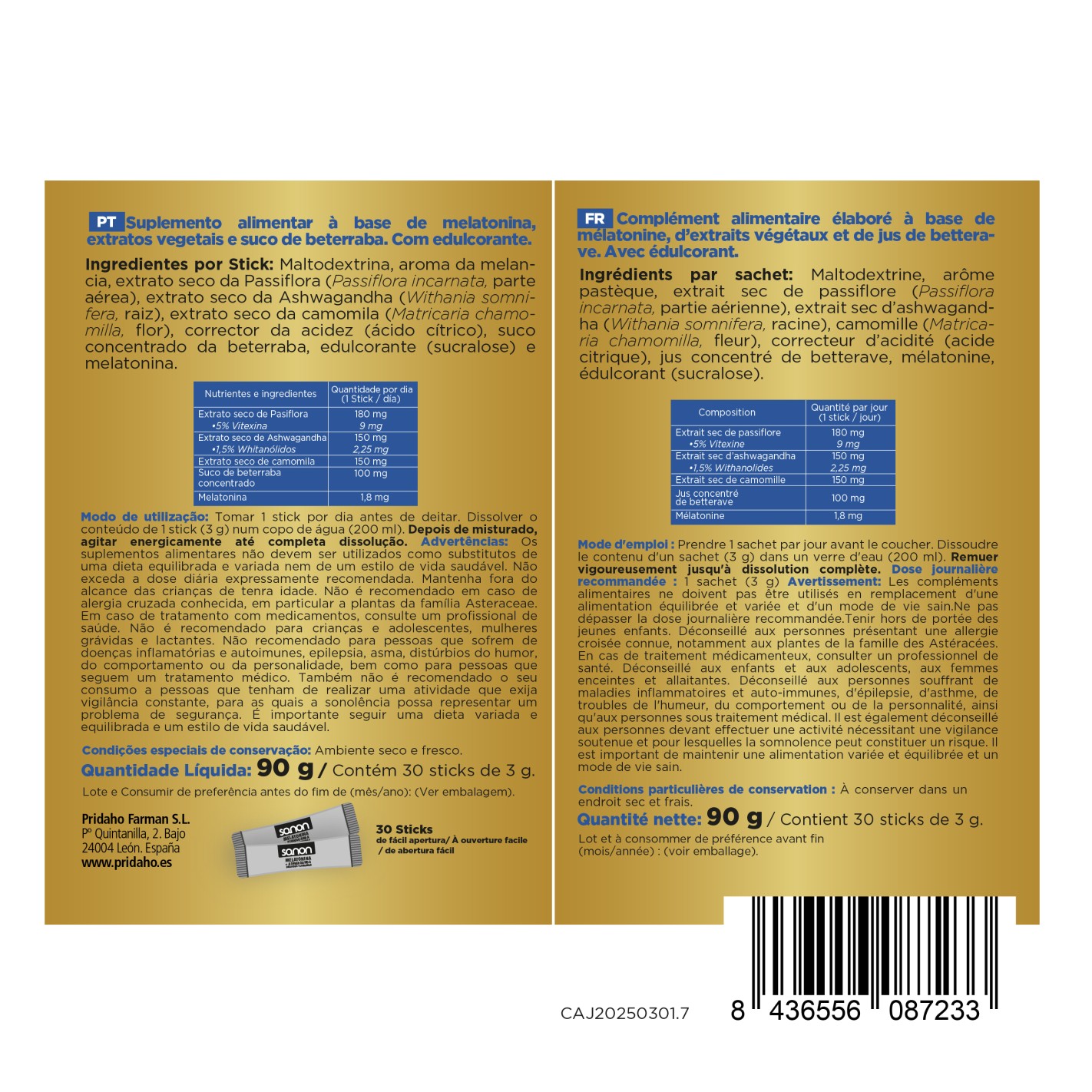 Ingredientes por stick: Maltodextrina, Aroma sandía, Pasiflora extracto seco (Pasiflora incarnata, parte aérea), Ashwaganda extracto seco (Withania somnífera, raíz), Camomila (Matricaria chamomilla, flor), Corrector de la acidez (ácido cítrico), Zumo concentrado de Remolacha, Melatonina, Edulcorante (sucralosa).
