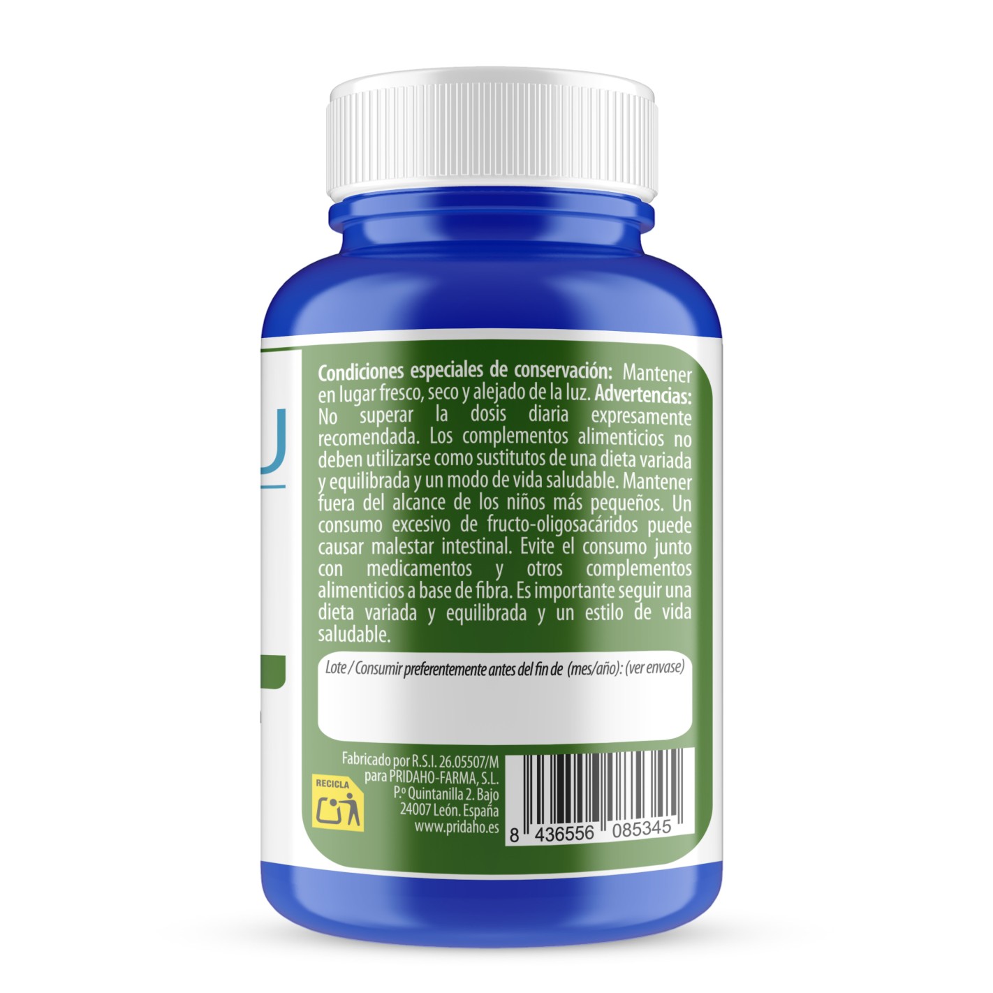 No superar la dosis diaria expresamente recomendada. Los complementos alimenticios no deben utilizarse como sustitutos de una dieta variada y equilibrada y un modo de vida saludable. Mantener fuera del alcance de los niños mas pequeños. Un consumo excesivo de fructo-oligosacáridos puede causar malestar intestinal. Evita el consumo junto con medicamentos y otros complementos alimenticios a base de fibra. Es importante seguir una dieta variada y equilibrada y un estilo de vida saludable.
