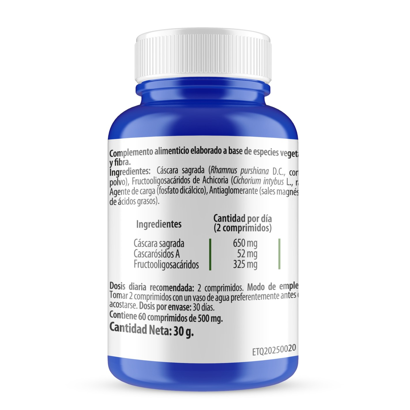 Cáscara sagrada (Rhamnus Purshiana D.C., corteza polvo), Fructooligosacáridos de Achicoria (Cichorium intybus L., raíz), Agente de carga (fosfato dicálcico), Antiaglomerante (sales magnésicas de ácidos grasos).