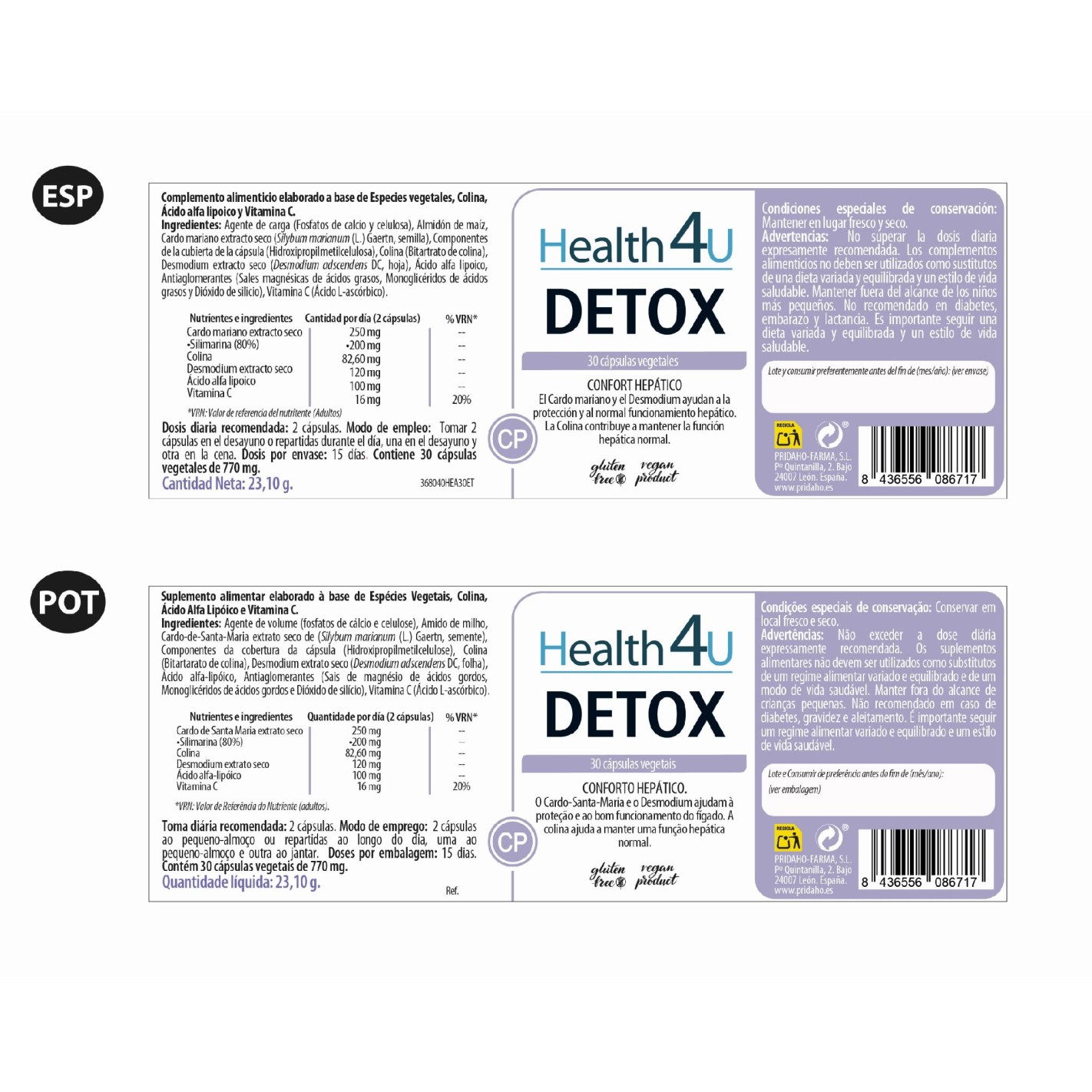 Agentes de carga (Fosfatos de calcio y celulosa), Almidón de maíz, cardo mariano extracto seco (silybum marianum, (L.) Gaertn, semilla). Componentes de la cubierta de la cápsula (Hidroxipropilmetilcelulosa), Colina (Bitartrato de Colina), Desmodium extracto seco (Desmodium adscendens DC, hoja), Ácido alfa lipoico, Antiaglomerantes (Sales magnésicas de ácidos grasos, Monoglicéridos de ácidos grasos y Dióxido de silicio), Vitamina C (Ácido L-Ascórbico).