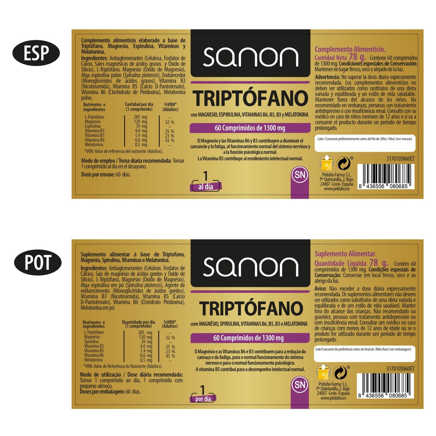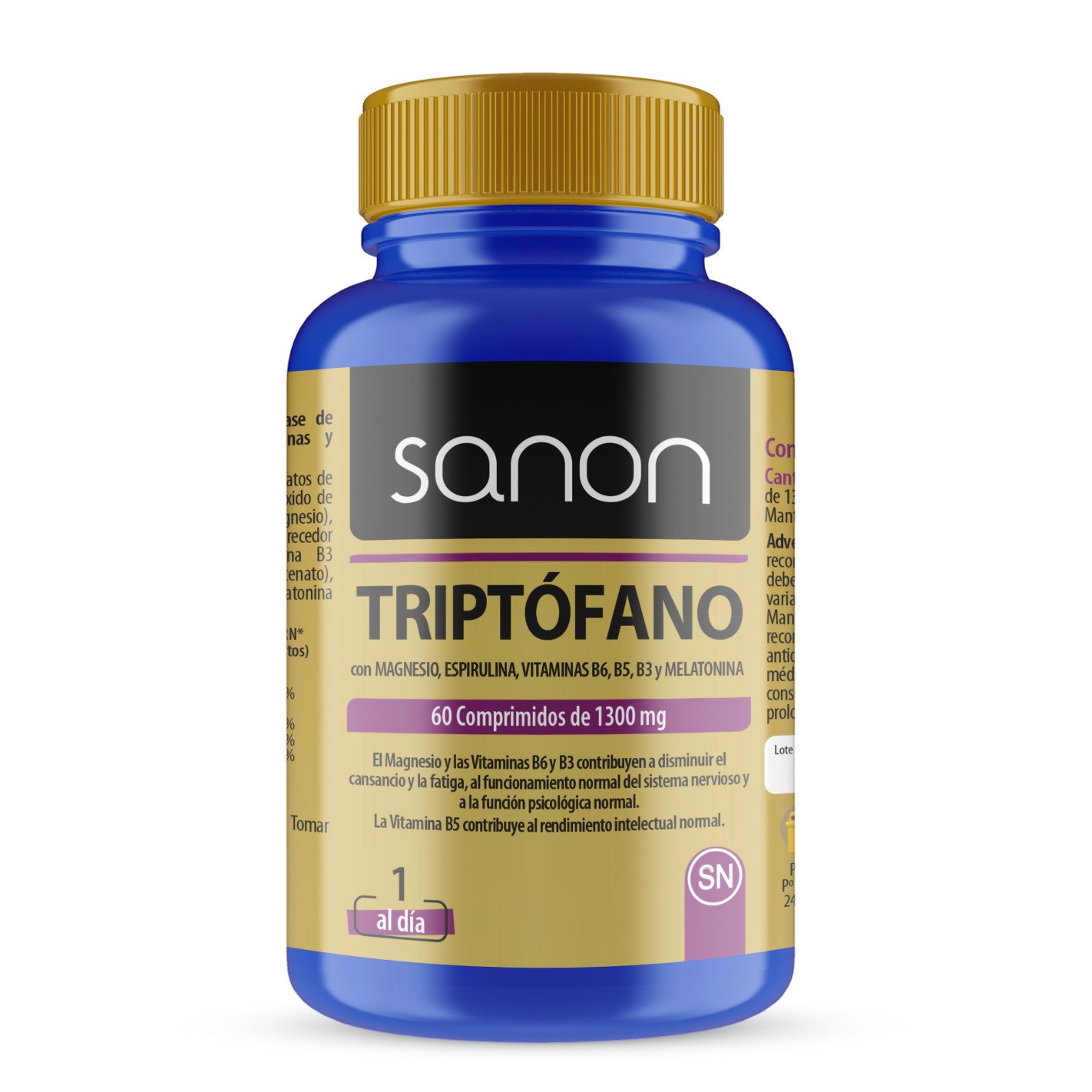 Complemento alimenticio elaborado a base de Triptófano, Magnesio, Espirulina, Vitaminas y Melatonina.
