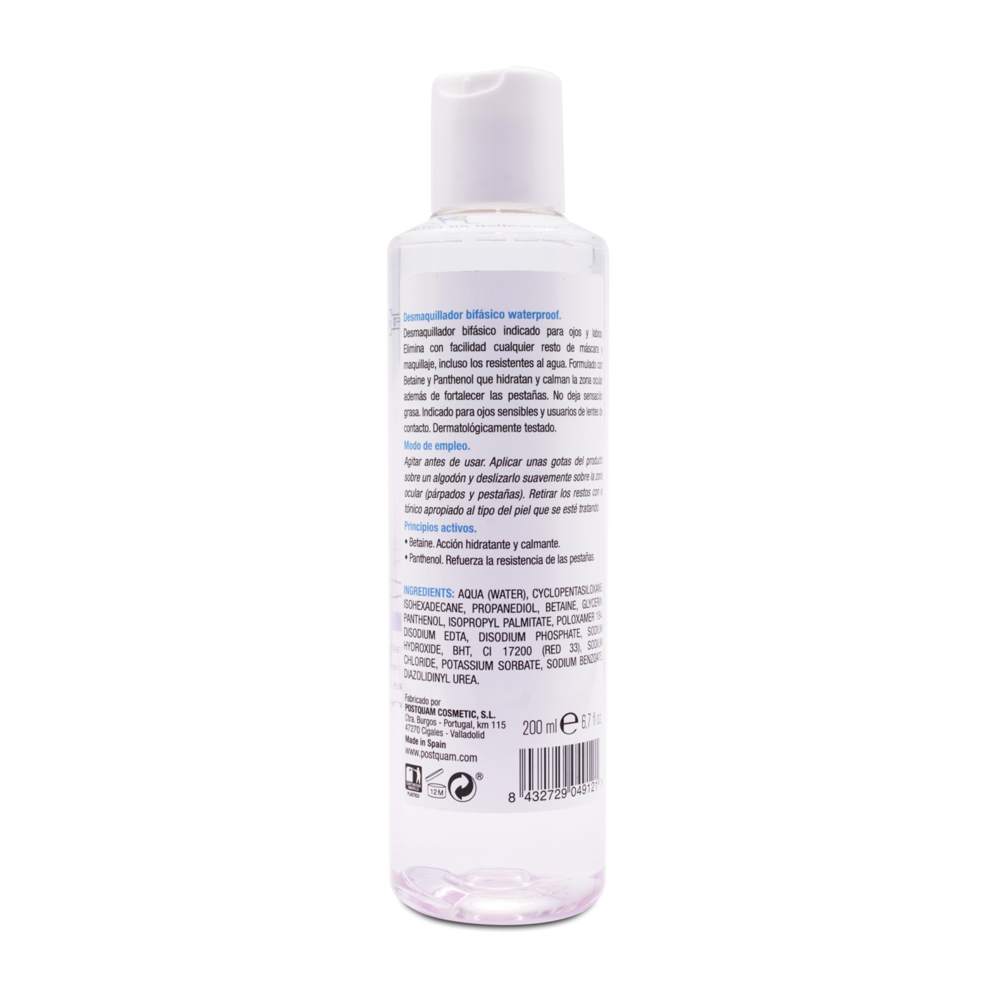 Modo de empleo: Agitar antes de usar. Aplicar unas gotas del producto sobre un algodón y deslizarlo suavemente sobre la zona ocular (párpados y pestañas). Retirar los restos con el tónico apropiado al tipo de piel que se esté tratando.