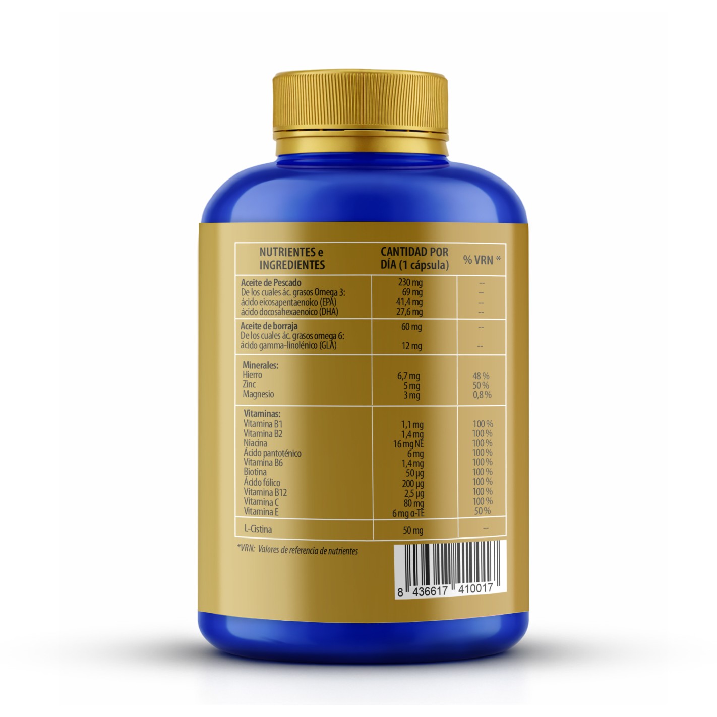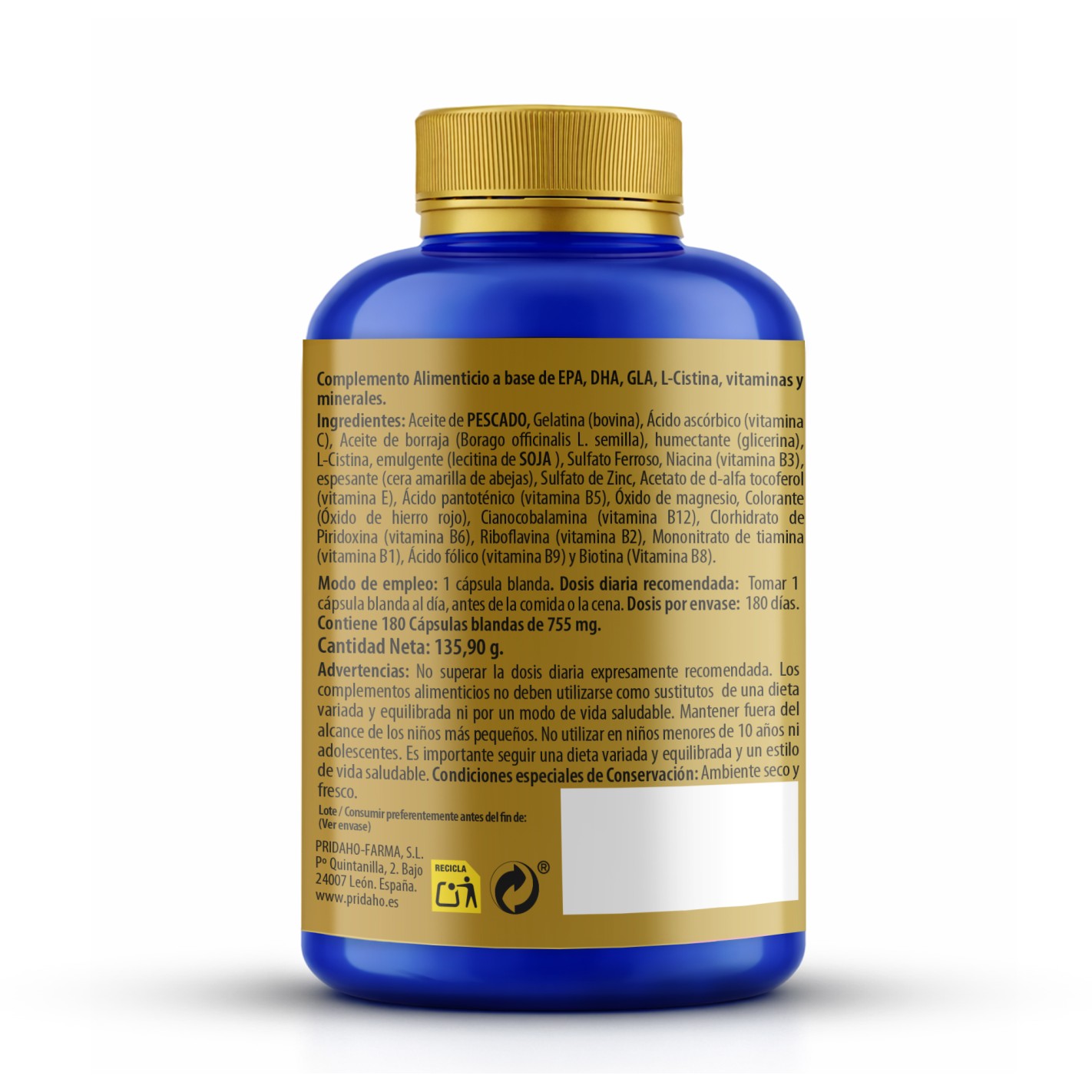 Complemento alimenticio a base de EPA, DHA, GLA, L-Cistina, vitaminas y minerales.