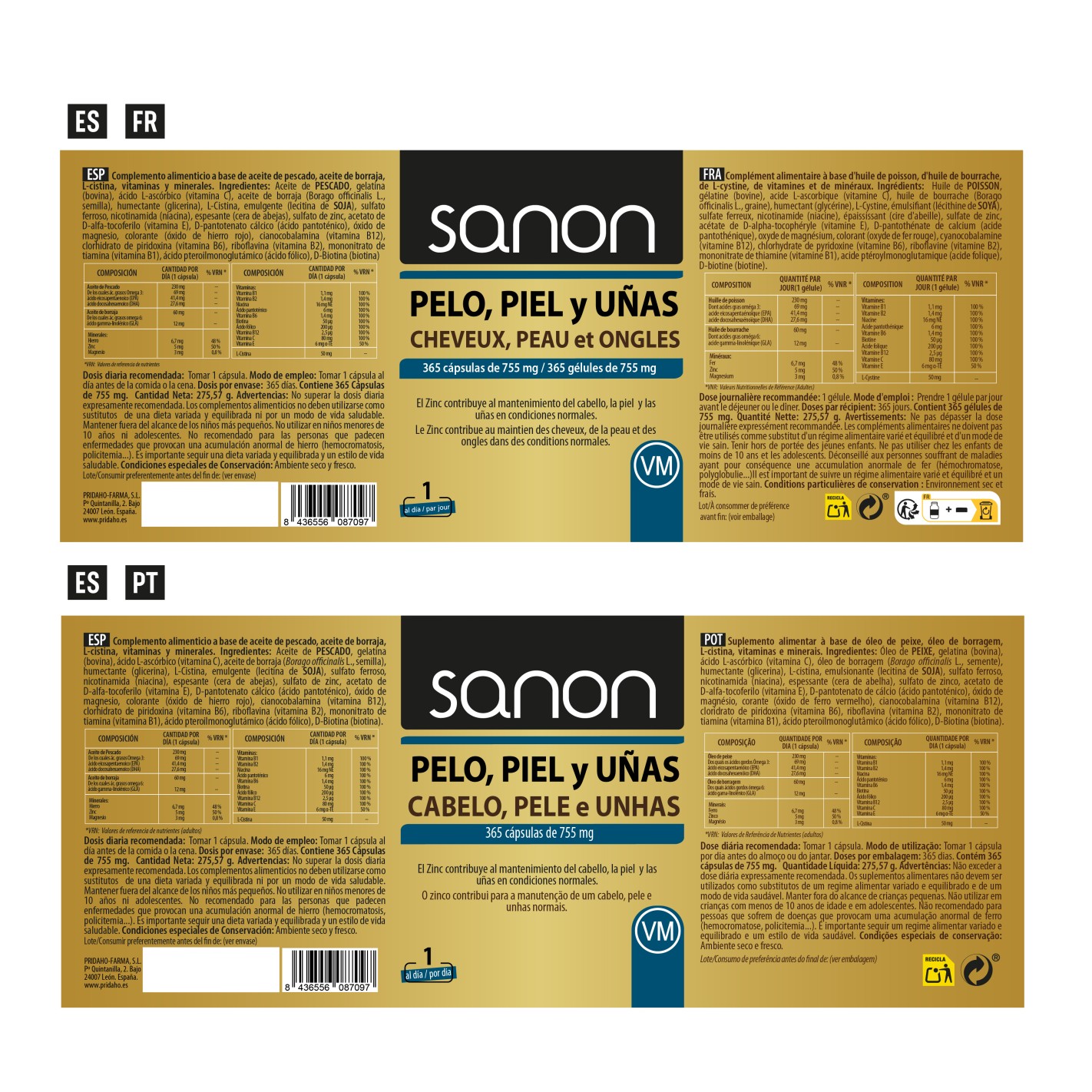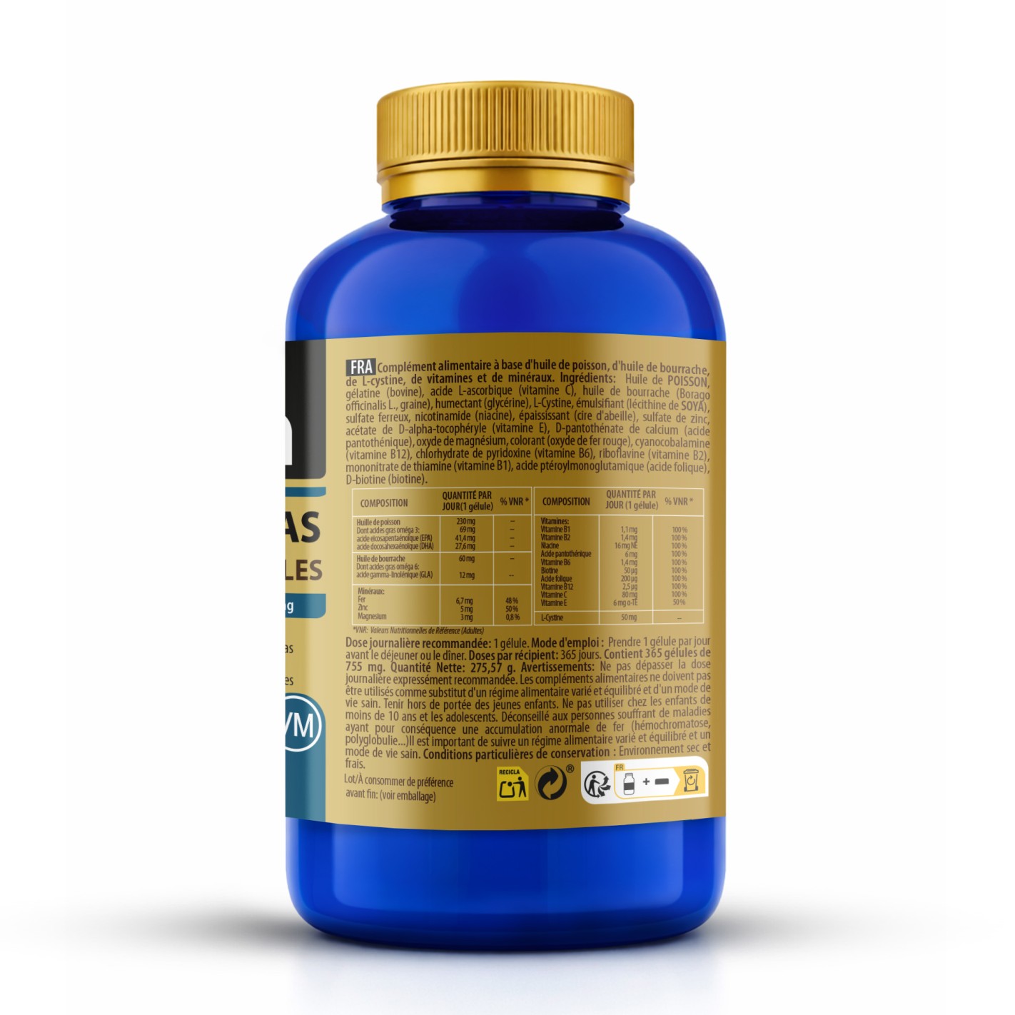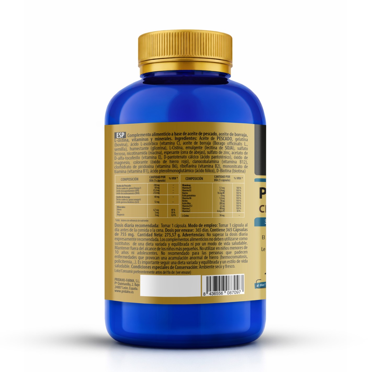 Ingredientes por cápsula: Aceite de pescado, gelatina , vitamina C, aceite de borraja (Borago officinalis L.), humectante (glicerina), L-Cistina, emulgente (lecitina de soja), sulfato ferroso, vitamina B3, espesante (cera amarilla de abejas), sulfato de zinc, vitamina E, vitamina B5, óxido de magnesio, colorante (óxido de hierro rojo), vitamina B12, vitamina B6, vitamina B2, vitamina B1, ácido fólico y biotina.