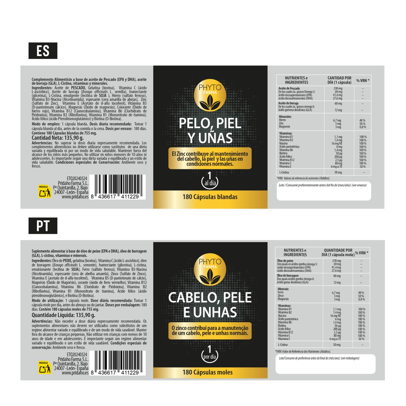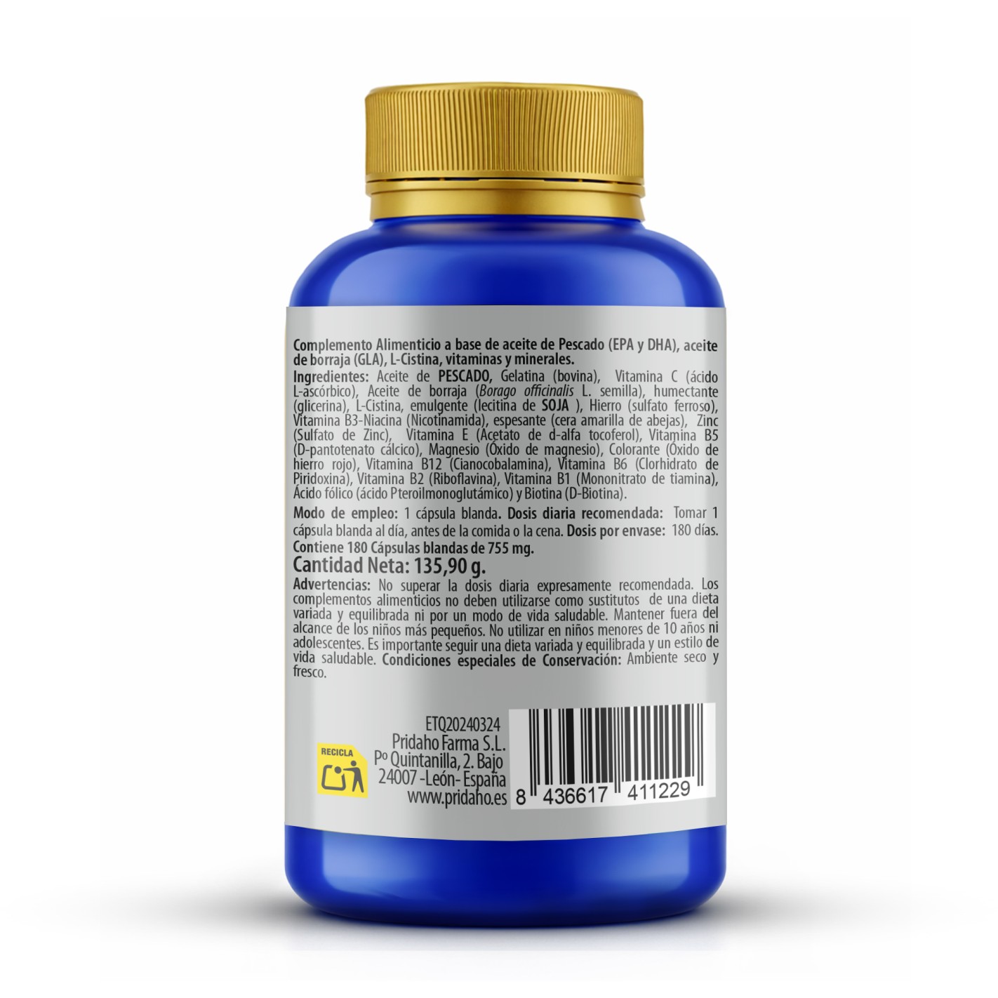 Aceite de PESCADO, Gelatina (bobina), Ácido ascórbico (Vitamina C), Aceite de Borraja (Borago officinalis L. semilla), humectante (glicerina), L-Cistina, emulgente (lecitina de SOJA), Sulfato Ferroso, Niacina (vitamina B3), espesante (cera amarilla de abejas), Sulfato de Zinc, Acetato de d-alfa tocoferol (Vitamina E), Ácido pantoténico (Vitamina B5), Óxido de Clorhidrato de Piridoxina (Vitamina B6), Riboflavina (Vitamina B2), Mononitrato de tiamina (vitamina B1), Ácido fólico (Vitamina B9) y Biotina (Vitamina B8).