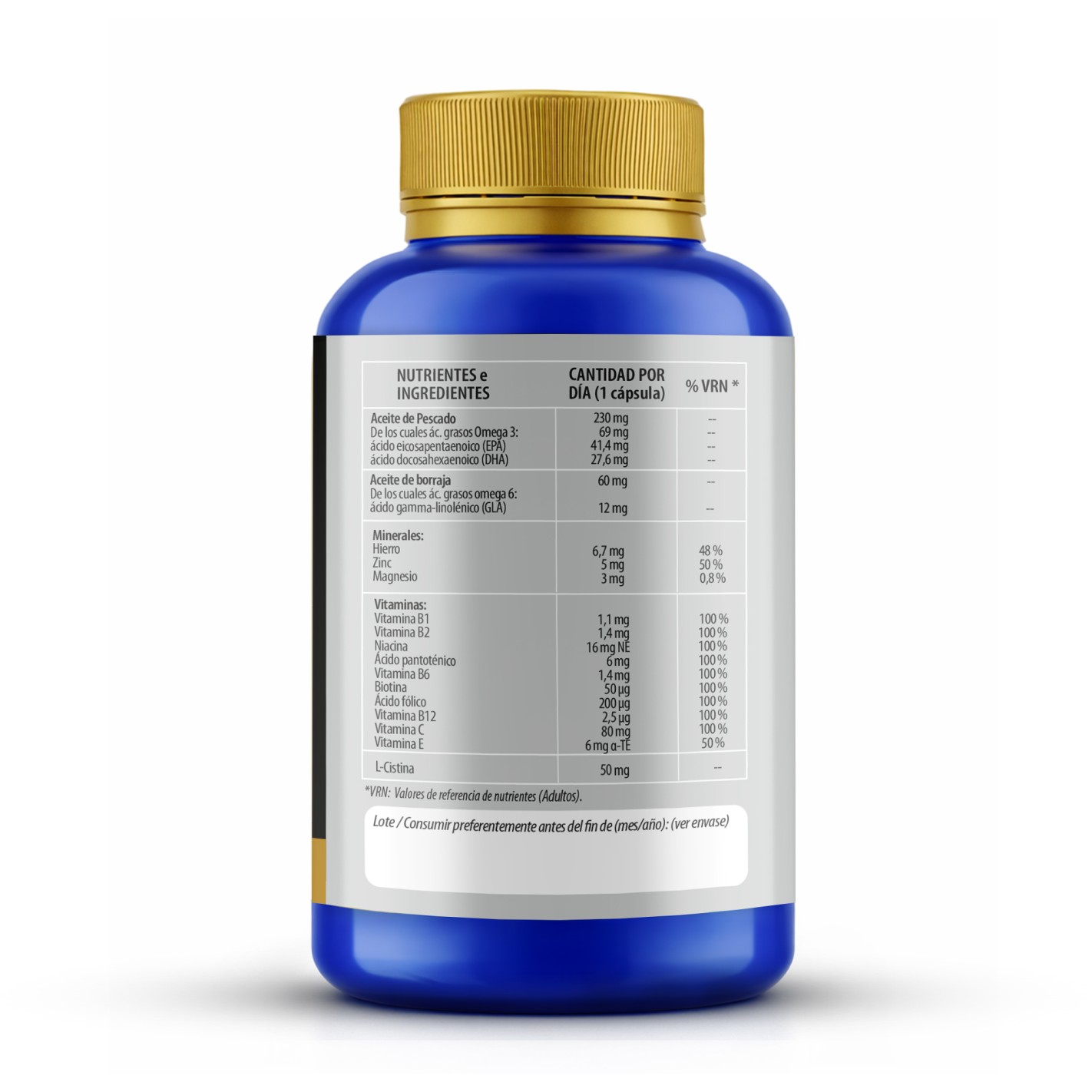 Complemento alimenticio a base de EPA, DHA, GLA, L-Cistina, vitaminas y minerales.