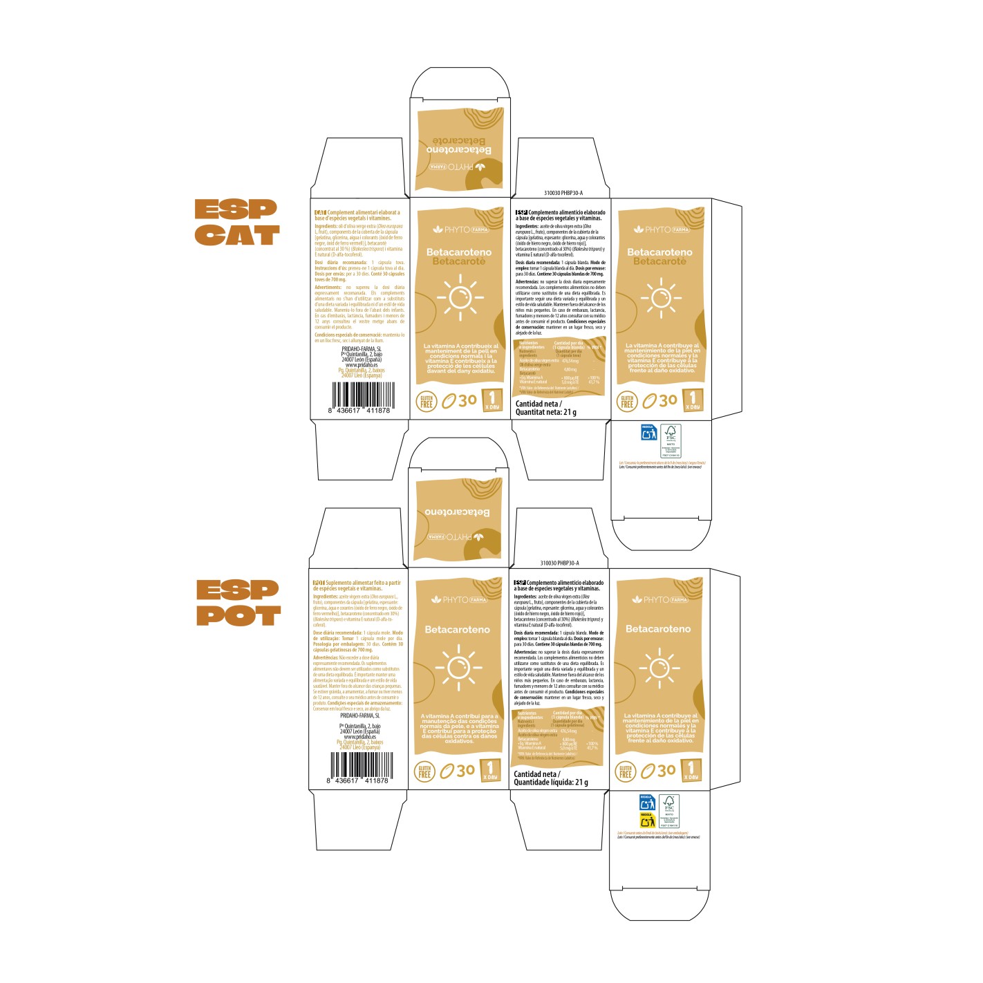 Aceite de Oliva virgen extra (Olea europaea L, Fruto.), Componentes de la cubierta de la cápsula [Gelatina, Glicerina, Agua y Colorantes (Óxido de hierro negro, Óxido de hierro rojo)], Betacaroteno (concentrado al 30%) (Blakeslea trispora), Vitamina E natural (D-alfa-tocoferol).