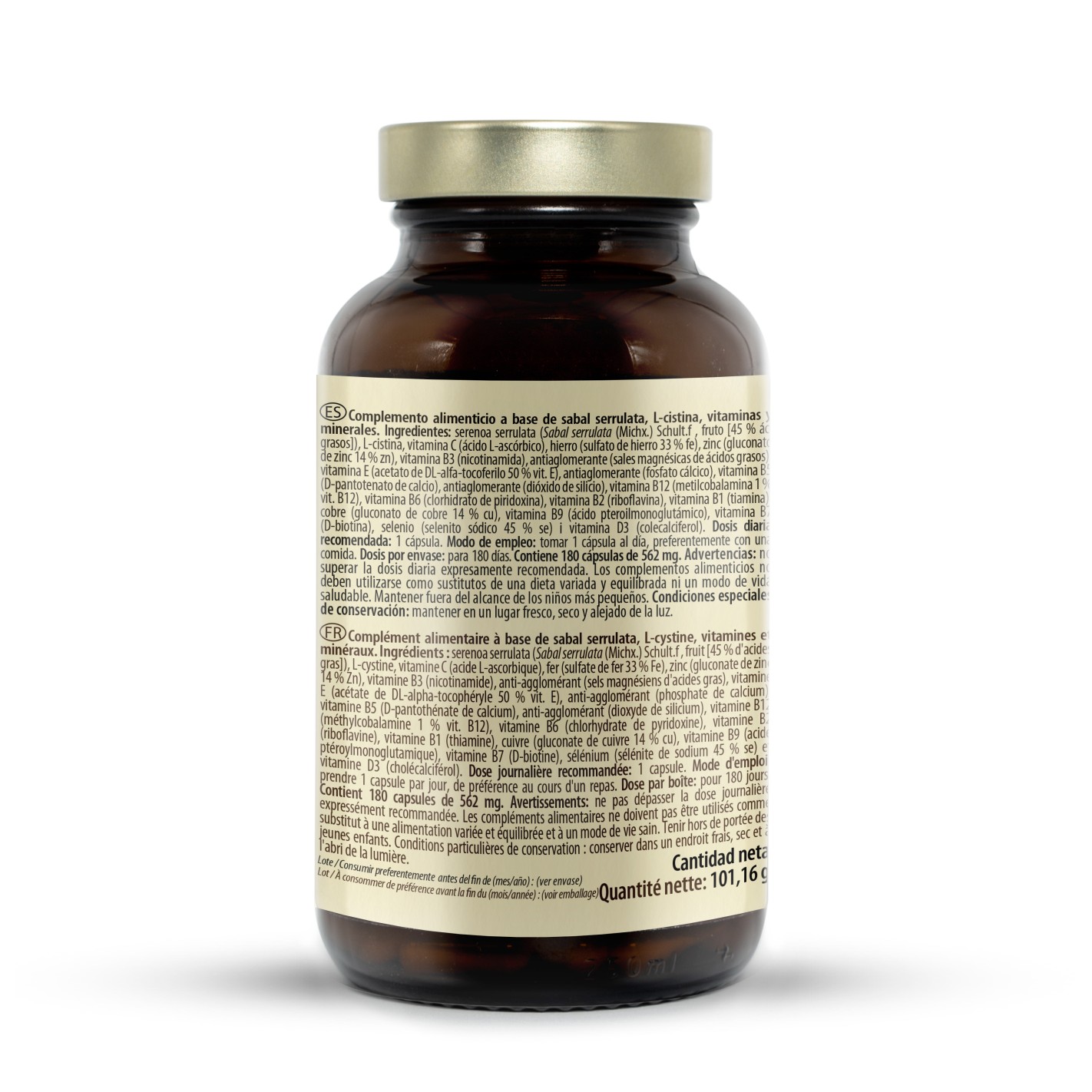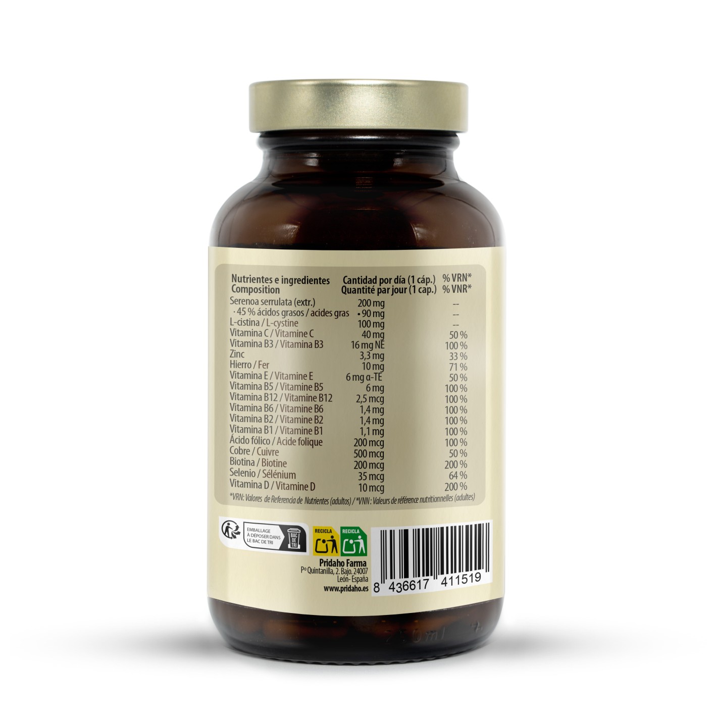 serenoa serrulata (Sabal serrulata (Michx.) Schult.f, fruto [45% ác. grasos]), L-Cistina, gluconato de zinc, vitamina C (ácidoL-ascórbico), sulfato ferroso, niacina (nicotinamida), antiaglomerante (sales magnésicas de ácidos grasos), vitamina E (acetato de DL-alfa-tocoferilo 50% vit E), antiaglomerante (fosfatos de calcio), ácido pantoténico (D-pantotenato cálcico), antiaglomerante (dióxido de silicio), Vitamina B12 (metilcobalamina 1% vit B12), vitamina B6 (clorhidrato de piridoxina), vitamina B2 (riboflavina), vitamina B1(tiamina), gluconato cúprico, folato (ácido pteroilmonoglutámico), vitamina B7 (D-Biotina), selenito de sodio y vitamina D3 (colecalciferol).