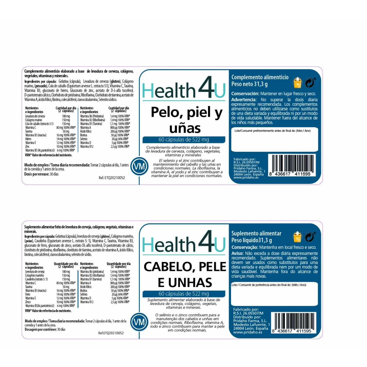 Ingredientes por capsulas: Agente de recubrimiento(capsula).gelatina, levadura de cerveza (gluten)(saccharomyces cerevisiae),colágeno hidrolizado, extracto cola de caballo (Equisetum arvence L.),gluconato de hierro-ascorbato de calcio(vitamina),gluconato de zinc, taurina , acetato D-alfa tocoferilo(vitamina E)niacina(vitamina B3),D-pantotenato cálcico(vitamina B5),Antiaglomerantes: sílice (E551) y estearato de magnesio(E470b),acetato de retinilo(vitamina A),piridoxina clorhidrato(vitaminaB6),riboflavina(vitaminaB2),clorhidrato de tiamina(vitamina B!) colecalciferol (vitamina D);maltodextrina, ácido pteroilmonoglutamico (ácido fólico)cianocobalamina(vitamina B12);maltodextrina, selenito sódico y D-biotina.