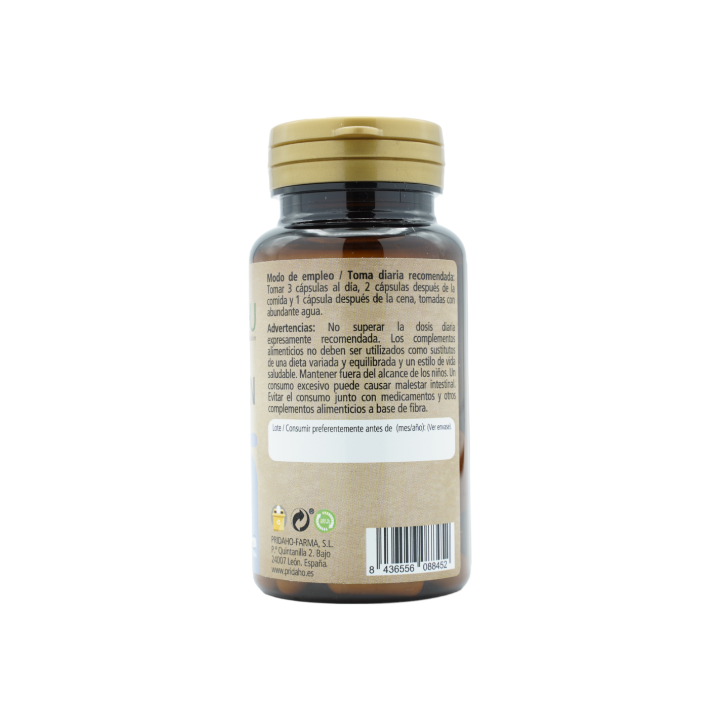 No superar la dosis diaria expresamente recomendada. Los complementos alimenticios no deben utilizarse como sustitutos de una dieta equilibrada. Mantener fuera del alcance de los niños más pequeños. Un consumo excesivo puede provocar problemas intestinales. Evitar el consumo junto con medicación y otros complementos alimenticios a base de fibra.