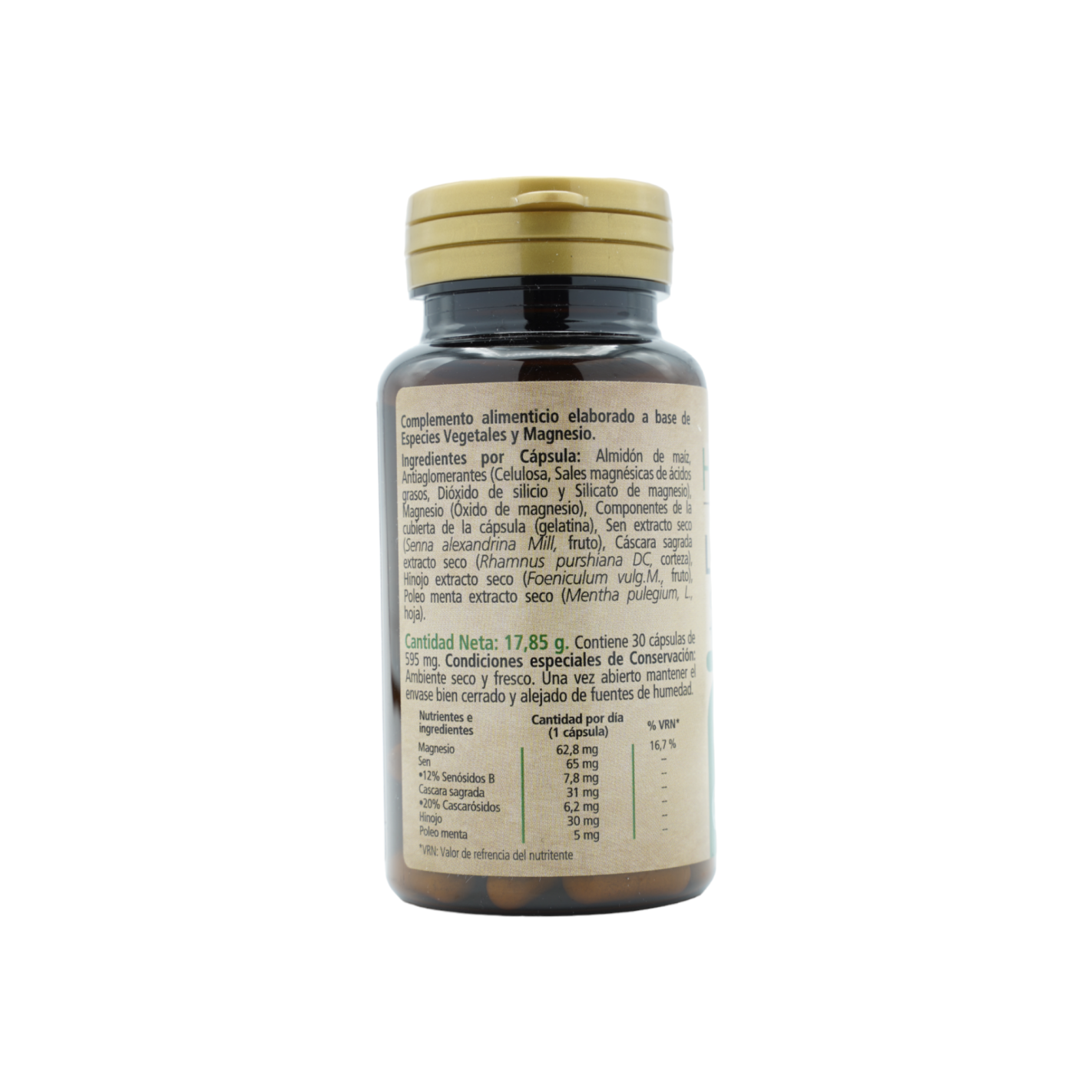 Ingredientes: Almidón de maíz, Sen extracto seco (Senna alexandrina Mill, hoja), Magnesio (Óxido de magnesio), Componentes de la cubierta de la cápsula (Hidroxipropilmetilcelulosa), Agentes de carga (Celulosa, Silicato de magnesio, Sales magnésicas de ácidos grasos y Dióxido de silicio), Frángula extracto seco (Rhamnus frangula L., corteza), Hinojo extracto seco (Foeniculum vulg. M, fruto).