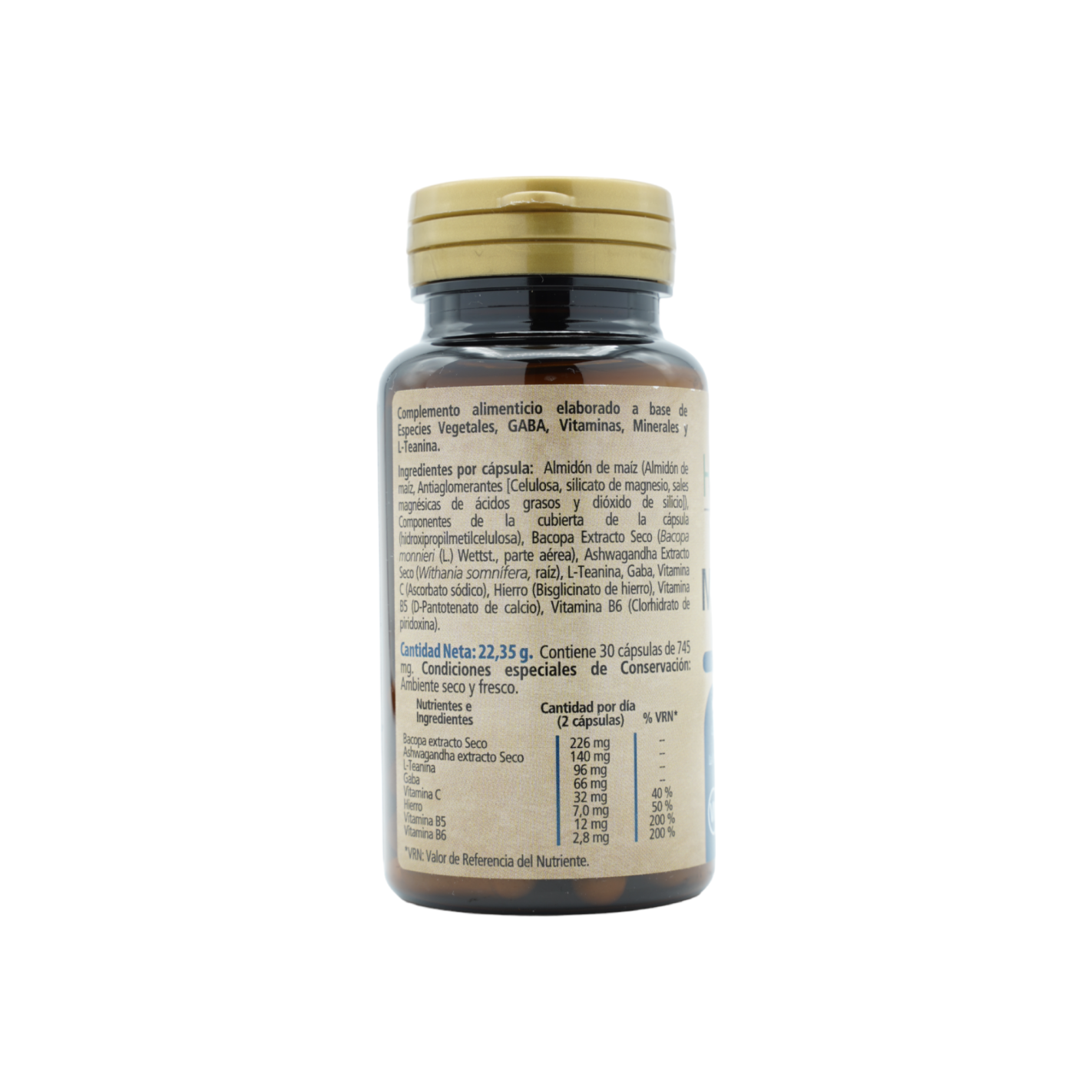Ingredientes por cápsula: Almidón de maíz (Almidón de maíz, Antiaglomerantes (Celulosa, silicato de magnesio, sales mágnesicas de ácidos grasos y dióxido de silicio)), Componentes de la cubierta de la cápsula (Hidroxipropilmetilcelulosa), Bacopa extracto seco (Bacopa monnieri (L) Wettst, parte aérea), Ashwagandha extracto seco (Withania, somnífera, raíz), L-Teanina, Gaba, Vitamina C (Ascorbato sódico), Hierro (Bisglicinato de hierro), Vitamina B5 (D-Pantotenato de calcio), Vitamina B6 (Piridoxina).