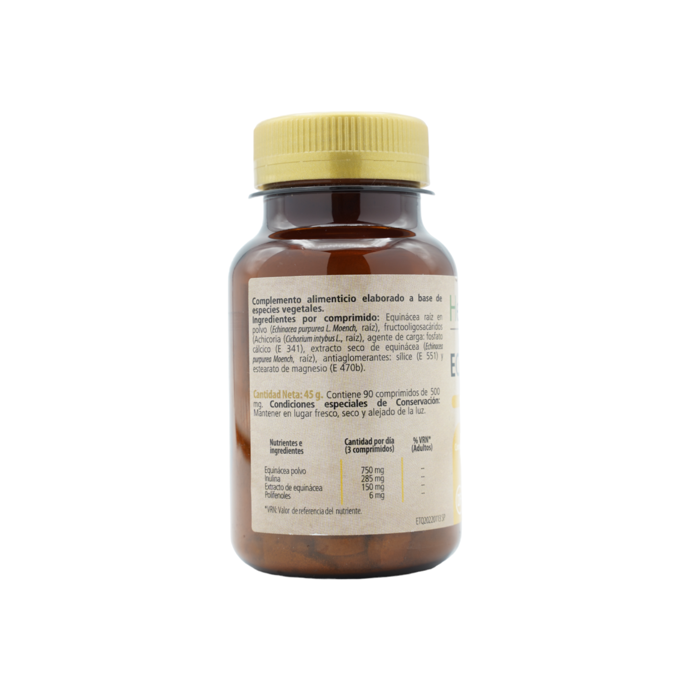 Ingredientes por comprimido: Equinácea raiz en polvo (Echinacea purpurea L.Moench, raíz),fructooligosacáridos (Achicoria (Cichorium intybus Raíz),agente de carga: fosfato cálcico(E 341) ,Antiaglomerantes: sílice (E 551) y estearato de magnesio( E 470b)