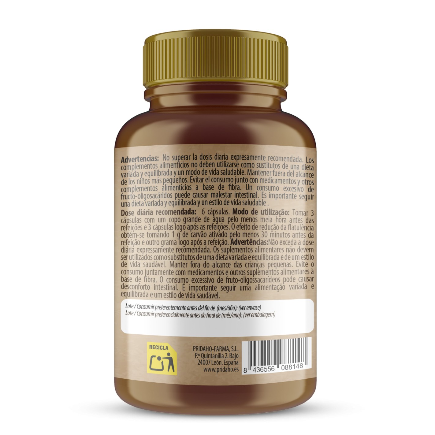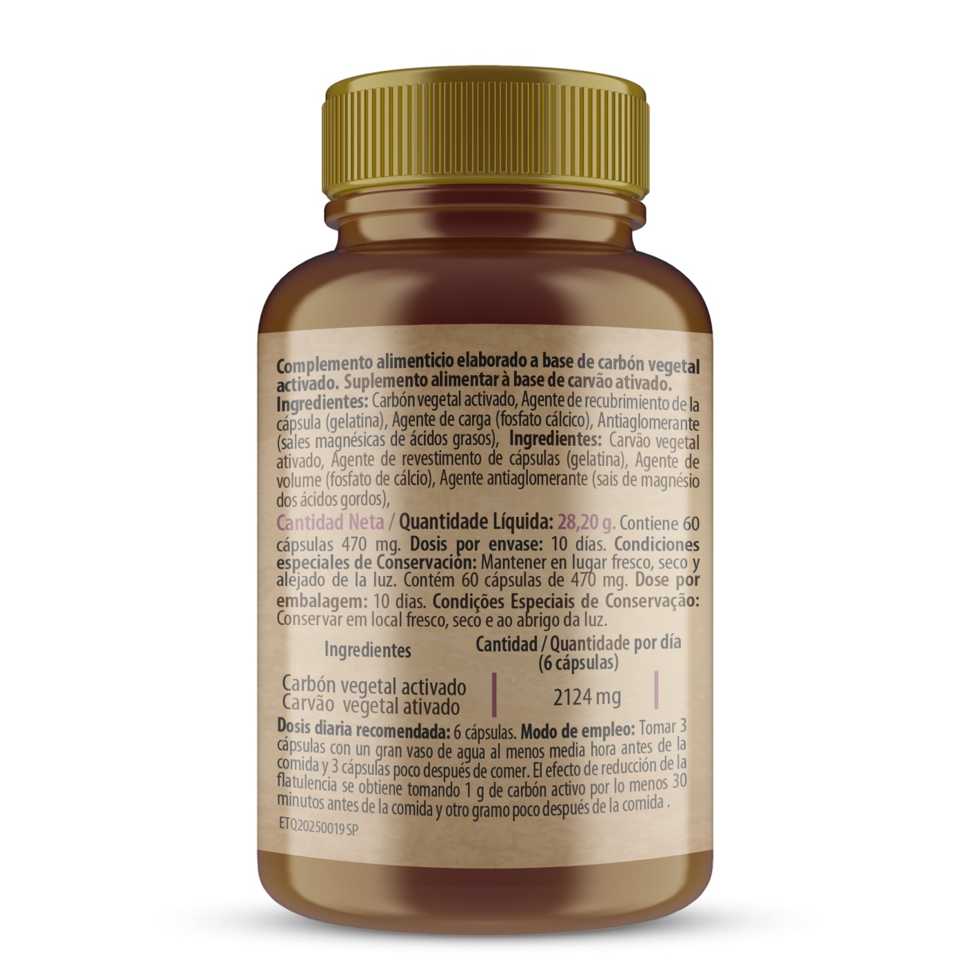 Complemento alimenticio elaborado a base de carbón activo vegetal activado. El carbón activo contribuye a reducir una flatulencia excesiva después de comer.
