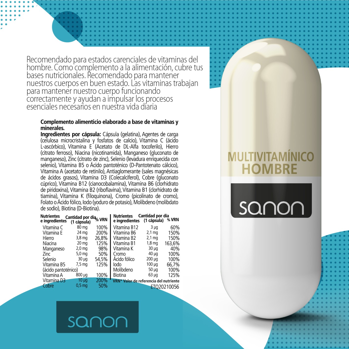 Ingredientes por cápsula: Cápsula (gelatina), Agentes de carga (celulosa microcristalina y fosfatos de calcio), Vitamina C (ácido L-Ascórbico), Vitamina E (Acetato de DL-Alfa Tocoferilo), Hierro (citrato ferroso), Niacina (nicotinamida), Manganeso (gluconato de manganeso), Zinc (citrato de zinc), Selenio (levadura enriquecida con Selenio), Vitamina B5 ó Ácido Pantoténico (D-Pantotenato cálcico), Vitamina A (Acetato de retinilo), Antiaglomerante (sales magnésicas de ácidos grasos), Vitamina D3 (Colecalciferol), Cobre (gluconato cúprico), Vitamina B12 (cianocobalamina), Vitamina B6 (clorhidrato de piridoxina), Vitamina B2 (rivoflavina), Vitamina B1 (clorhidrato de Tiamina), Vitamina K (Filoquinona), Cromo (Picolinato de cromo), Folato o Ácido fólico, Iodo (yoduro de potasio), Molibdeno (Molibdato de sodio), Biotina (D-Biotina).