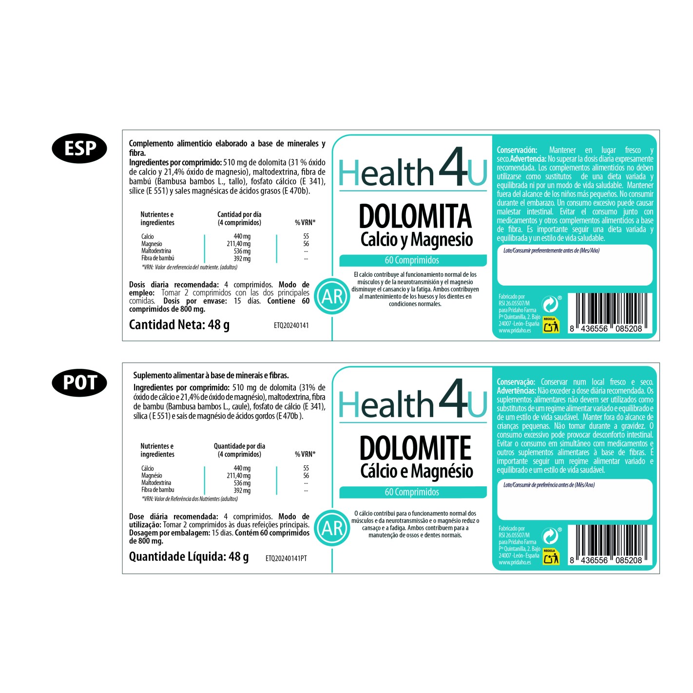 510 mg de dolomita (31% óxido de calcio y 21,4% óxido de magnesio), maltodextrina, fibra de bambú (Bambusa bambos L., tallo), fosfato cálcico (E341), sílice (E551) y estearato de magnesio (E470b).