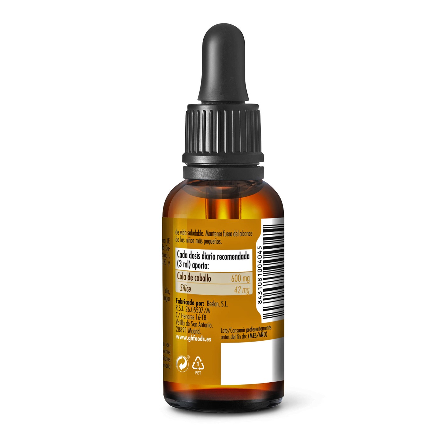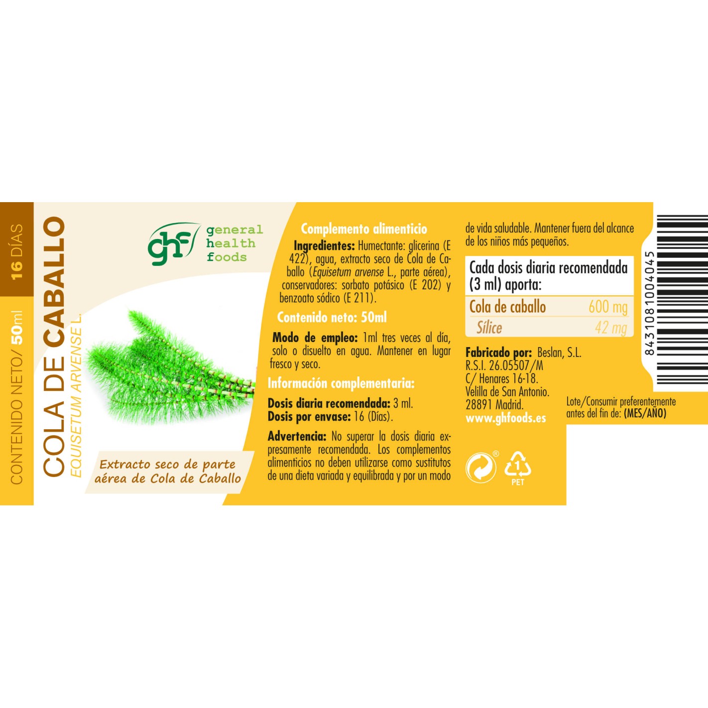 Ingredientes: Humectante, glicerina (E422), agua, extracto seco de cola de caballo (Equisetum arvense L parte aérea), conservadores: sorbato potásico (E202) y benzoato sódico (E211).