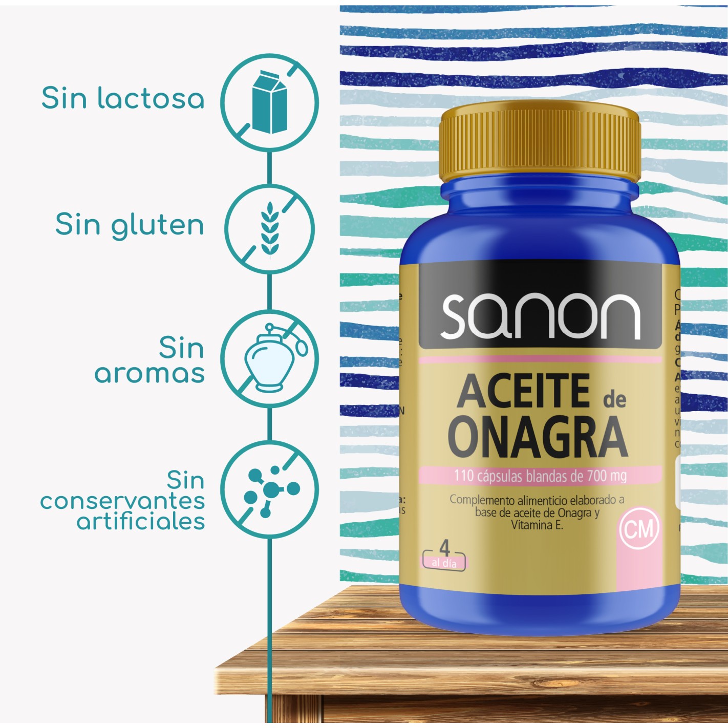 Complemento alimenticio elaborado a base de ácidos grasos esenciales (Aceite de Onagra) y Vitamina E.