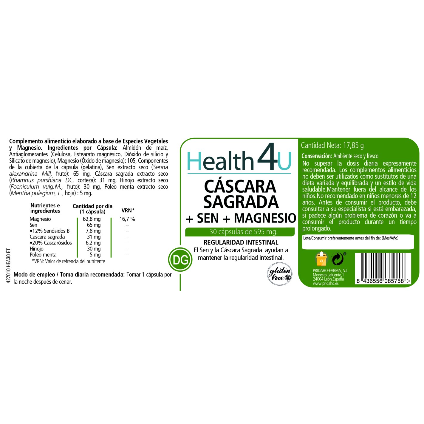 Almidón de maíz, Anti aglomerantes (Celulosa, Estearato magnésico, Dióxido de silicio y Silicato de magnesio), Magnesio (Óxido de magnesio): 105, Componentes de la cubierta de la cápsula (Gelatina), Sen extracto seco (Senna alexandrina Mill, fruto): 65 mg, Cáscara sagrada extracto seco (Rhamnus purshiana DC, corteza): 31 mg, Hinojo extracto seco (Foeniculum vulg.M, fruto): 30 mg, Poleo menta extracto seco (Mentha pulegium, L, hoja): 5 mg.