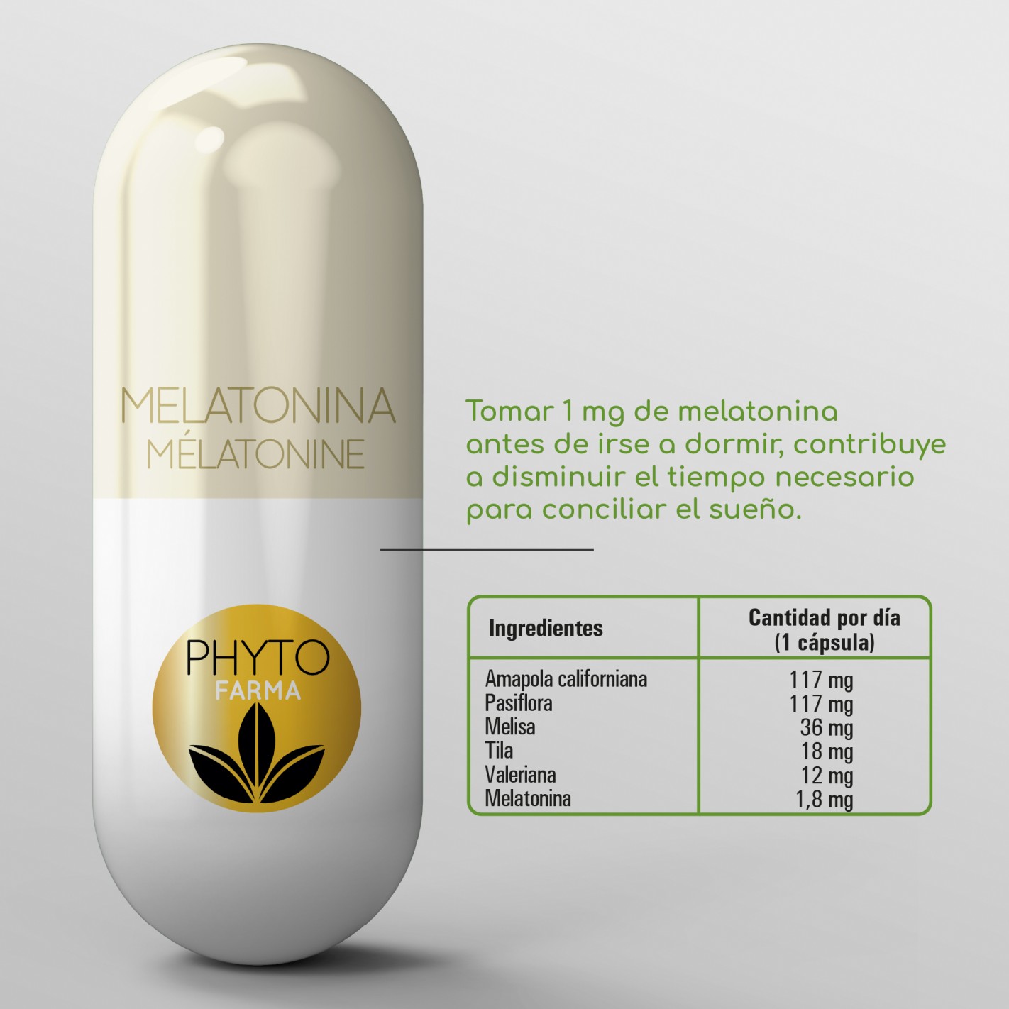Ingredientes por cápsula: Amapola california extracto seco (ESchscholzia california Cham, partes aéreas), Pasiflora extracto seco (passiflora incarnata L, partes aéreas), Almidónde maiz, Componebtesde la cubierta de la cápsula (gelatina), Melisa extracto seco (Melissa officionalis L., hoja),