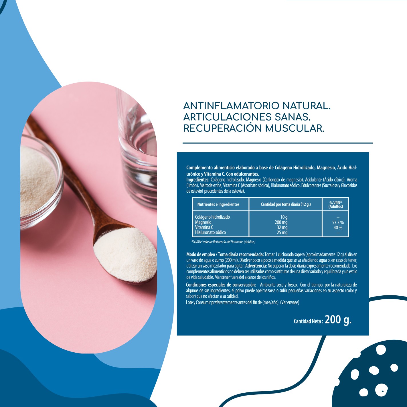 Complemento alimenticio elaborado a base de Colágeno Hidrolizado, Magnesio, Ácido Hialurónico y Vitamina C. Con edulcorante.