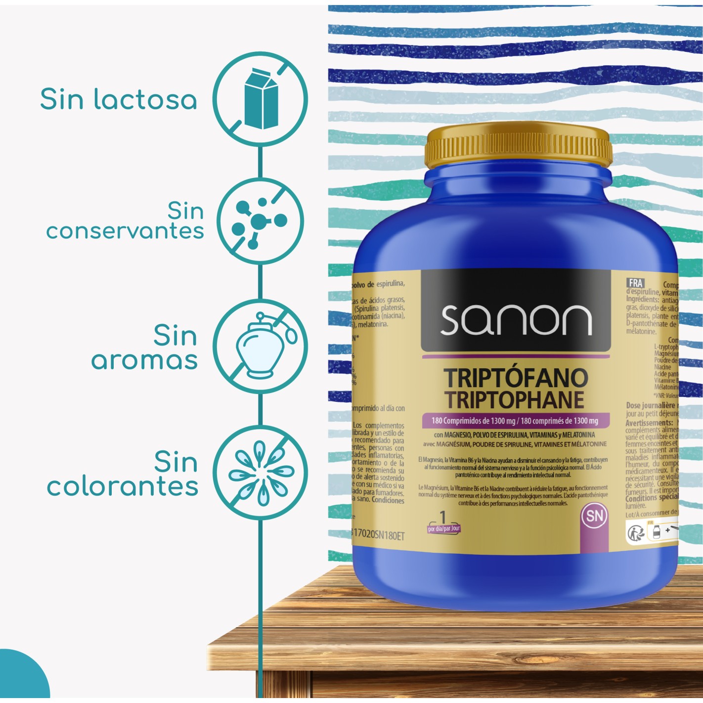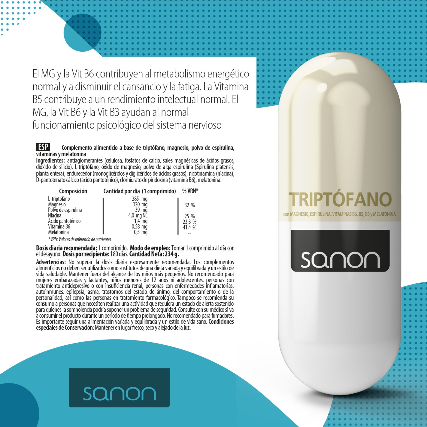 Complemento alimenticio a base de Triptófano, Magnesio, polvo de Espirulina, Vitaminas y Melatonina.