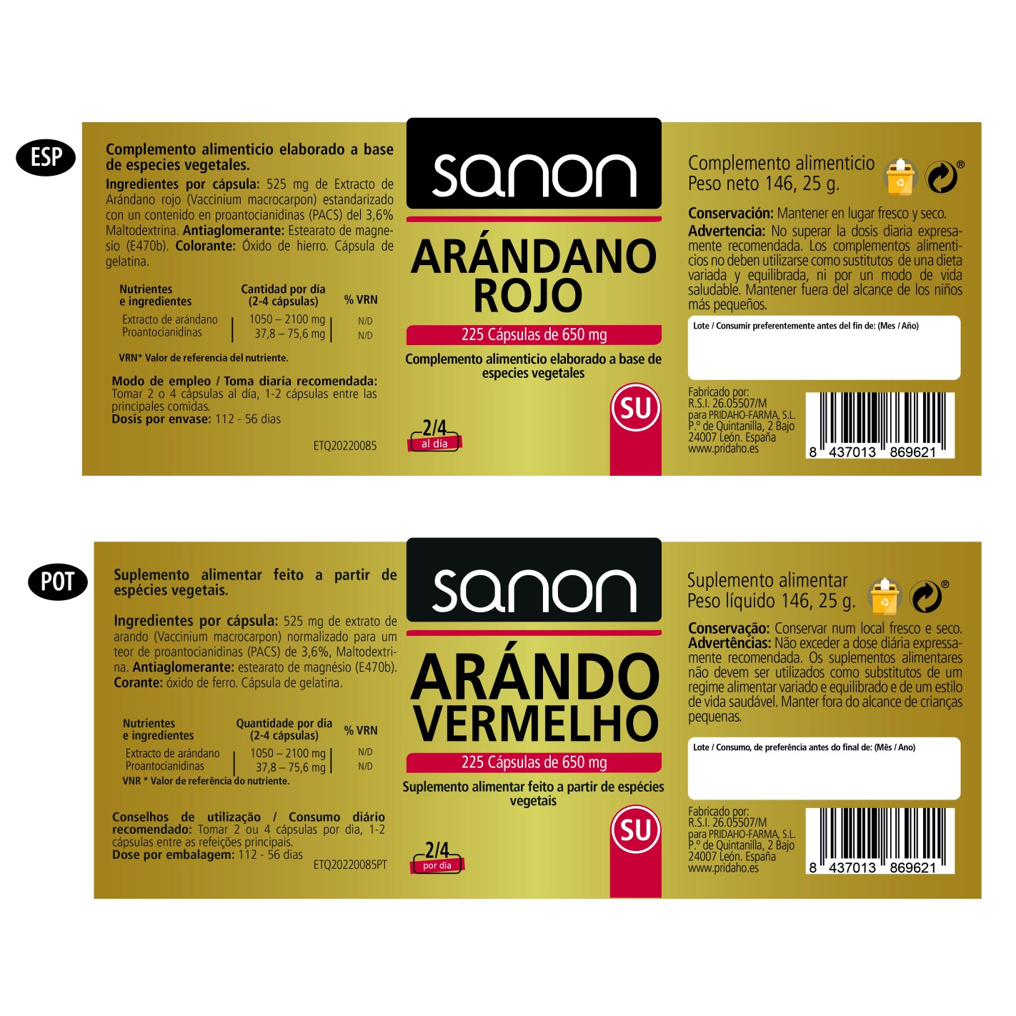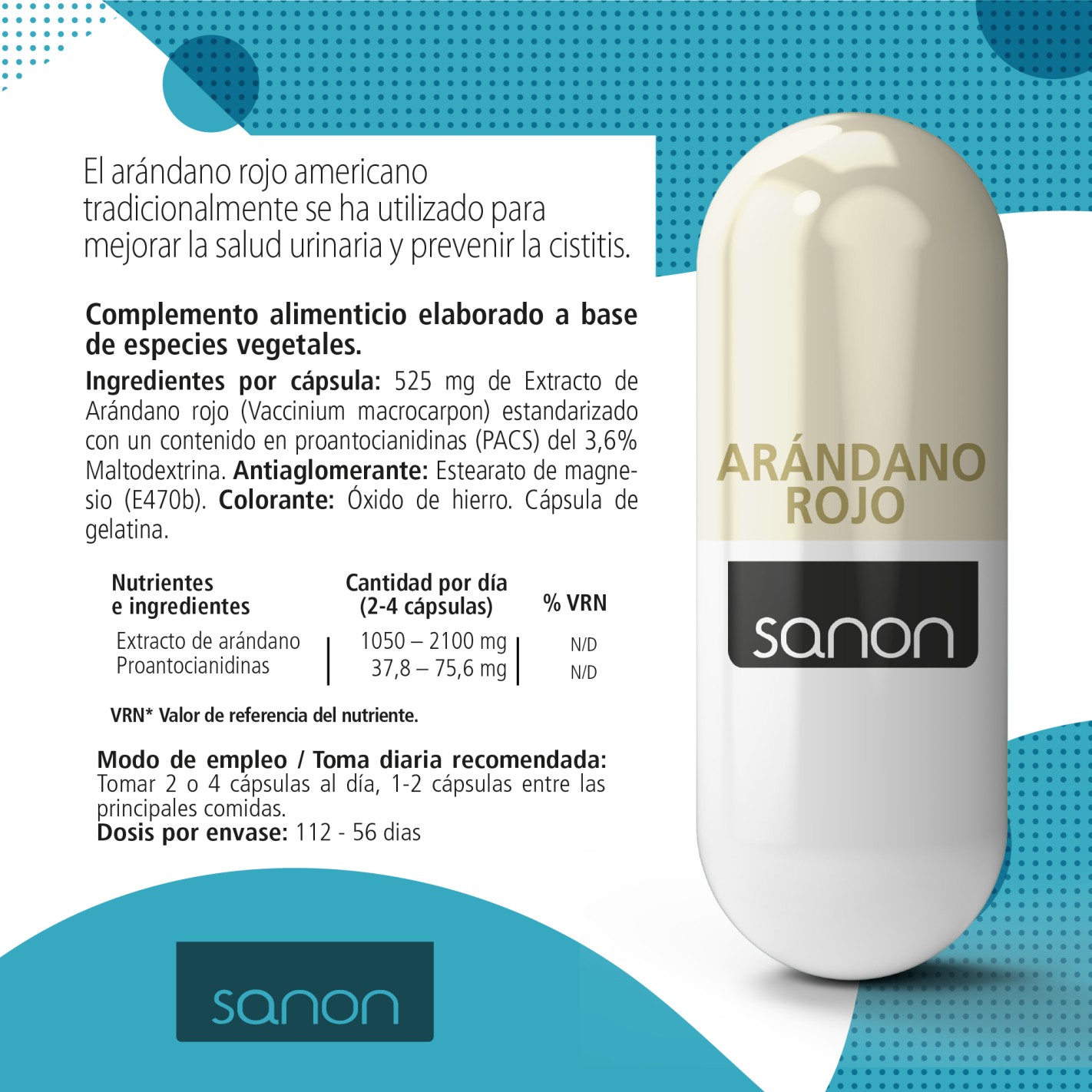 Ingredientes por capsula: 525 mg de extracto de Arándano rojo. (Vaccinium macrocarpon) estandarizado con un contenido en proantocianidinas (PACS) del 3.6 % Maltodextrina. Antiaglomerantes: Estearato de magnesio (E 470 B) Colorante: Óxido de hierro. Capsula de gelatina.
