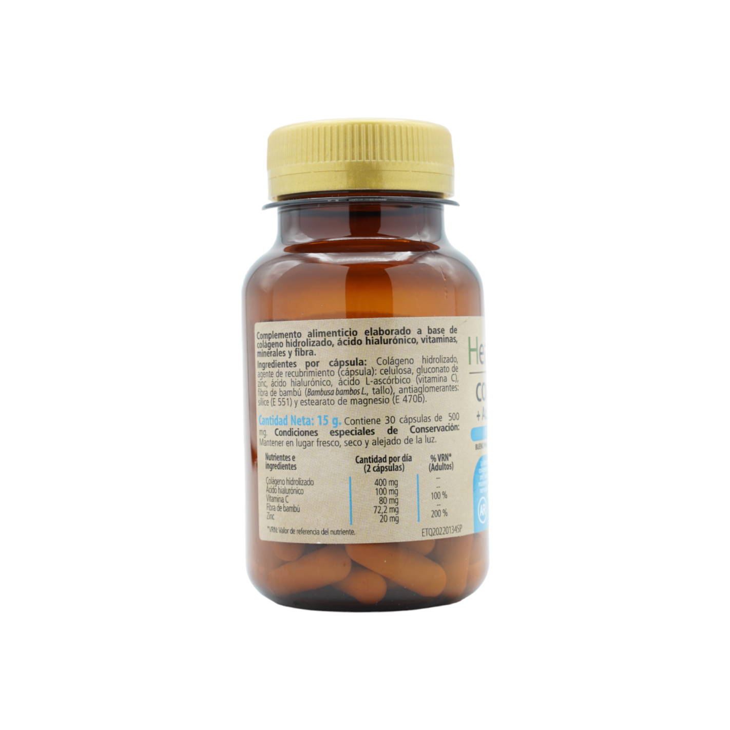 Complemento alimenticio elaborado a base de Colágeno hidrolizado, Ácido hialurónico, Vitaminas y Minerales.