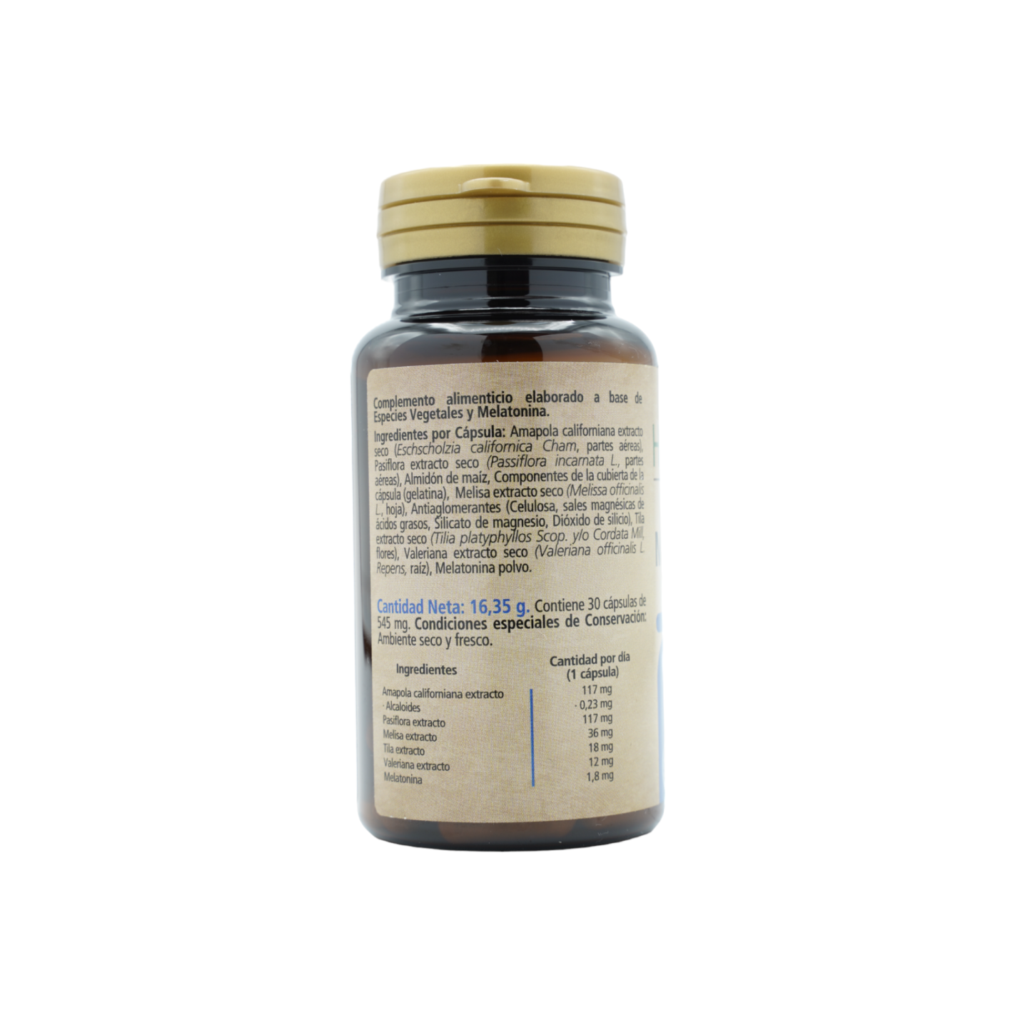 Amapola californiana extracto seco (Echscholzia californica Cham, partes aéreas), Pasiflora extracto seco (Passiflora incarnata L, partes aéreas), Almidón de maíz, Componentes de la cubierta de la cápsula (gelatina) Melisa extracto seco (Melissa officinalis L, hoja), Antiaglomerantes (Celulosa, sales magnésicas de ácidos grasos, Silicato de Magnesio, Dióxido de silicio), Tila extracto seco (Tilia platyphyllos Scop. y/o Cordata Mill, flores) Valeriana extracto seco (Valeriana officinalis L Repens, raíz) , Melatonina polvo.